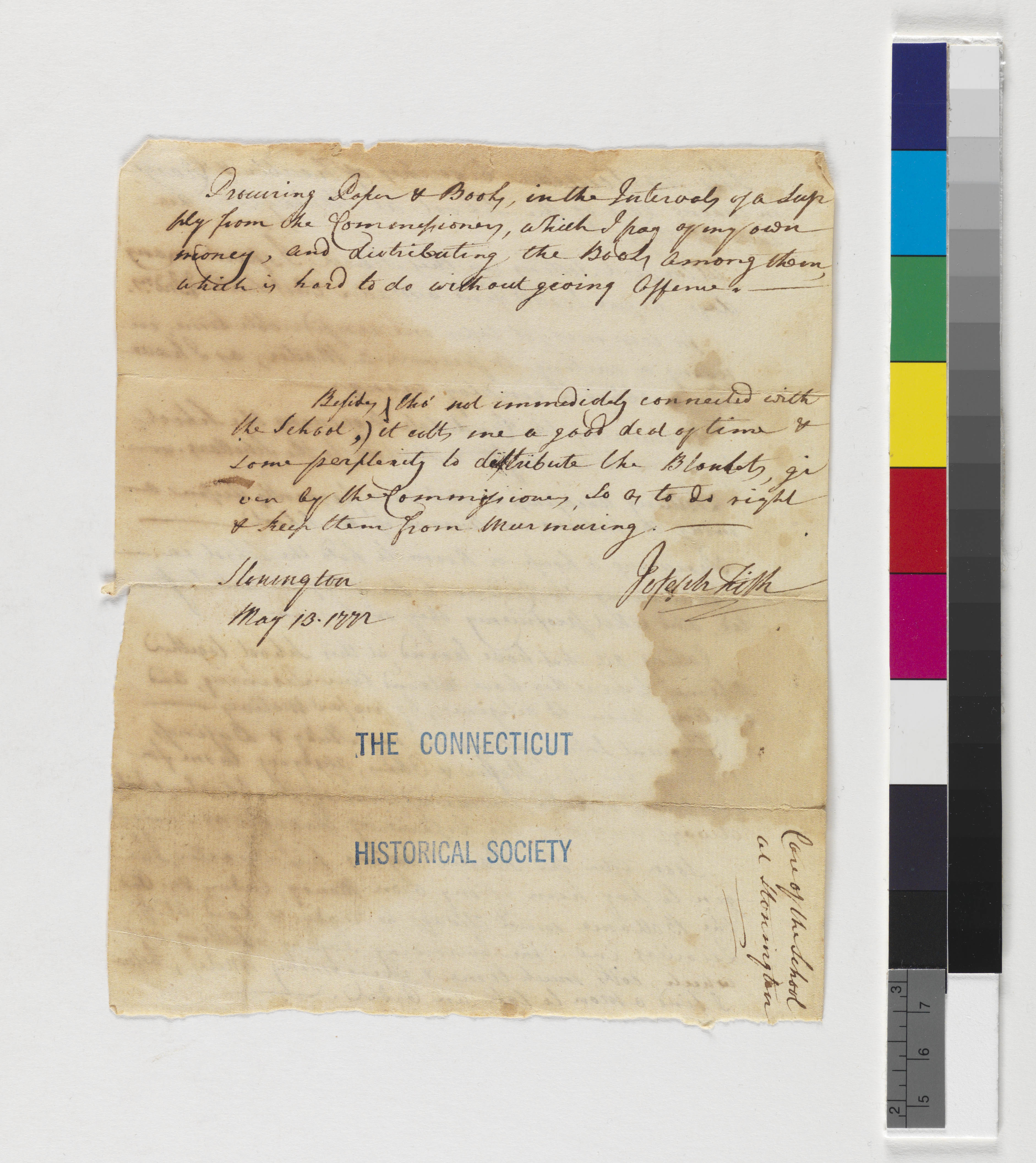 Buildings/Structures -- School House; Commerce/Trade -- Blankets; Culture -- Children; Education/Schools -- Missions -- Connecticut -- Stonington; Land -- Reservation/Reserve -- Pequot -- Eastern; Literature -- School Books; Religion/Beliefs -- Christianity -- Missions/Praying Towns -- Connecticut -- Stonington (Wequetequock Indian Mission) -- Joseph Fish (1732-1781) missionary; Tribes/Communities -- Pequot -- Eastern; YIPP -- Colony of Connecticut Collection, 1603-1783