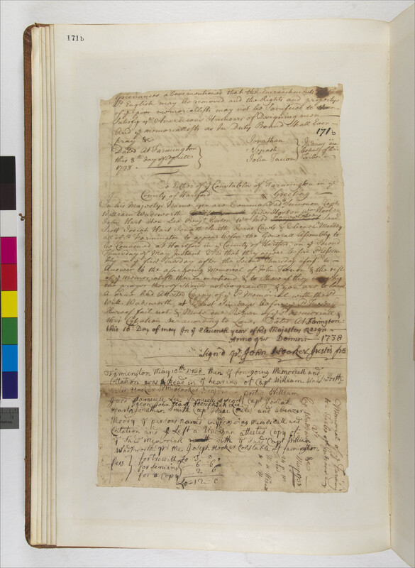 Connecticut General Assembly (Recipient); Cowls, Isaac (Mentioned within document); Hart, John, 1684-1753 (Mentioned within document); Hart, Josiah (Mentioned within document); Hooker, Giles (Mentioned within document); Hooker, John, 1664-1746 (Mentioned within document); Hooker, William (Mentioned within document); Judd, William, 1698-1751 (Mentioned within document); Lee, Hezekiah, 1697-1762 (Mentioned within document); Lee, Samuel, 1694-1760 (Mentioned within document); Lewis, Daniel, 1691- (Mentioned within document); Moody (Moodey), Ebenezer, 1706-1748 (Mentioned within document); Porter, Benjamin (Mentioned within document); Root, Joseph, 1693- (Mentioned within document); Scott, Samuel (Mentioned within document); Smith, Jonathan (Mentioned within document); Wadsworth, Thomas, 1680- (Mentioned within document); Wadsworth, William (Mentioned within document)