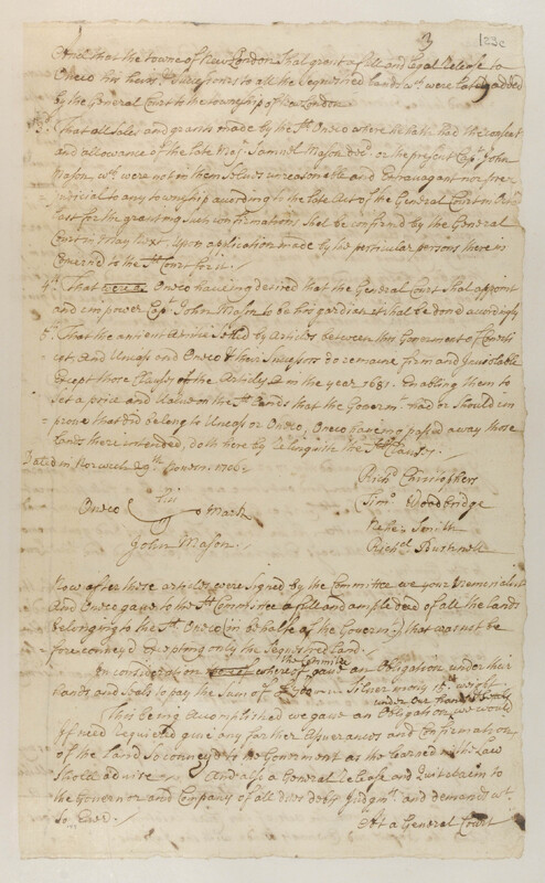 Christophers, Richard (Mentioned within document); Connecticut General Court (Recipient); Dudley, Joseph (Mentioned within document); Haynes, John (Mentioned within document); Kimberly, Eleazar, 1639-1709 (Attestor); Ludlow, Roger (Mentioned within document); Mason, John, 1600-1672 (Mentioned within document); Mason, John, 1670-1736 (Mentioned within document); Mason, Samuel, 1644-1704 (Mentioned within document); Miantonomo (Mentioned within document); Owaneco, 1640- (Mentioned within document); Stuart, Anne (Mentioned within document); Uncas, 1590-1683 (Mentioned within document); Woodbridge, Timothy, Senior (Mentioned within document)