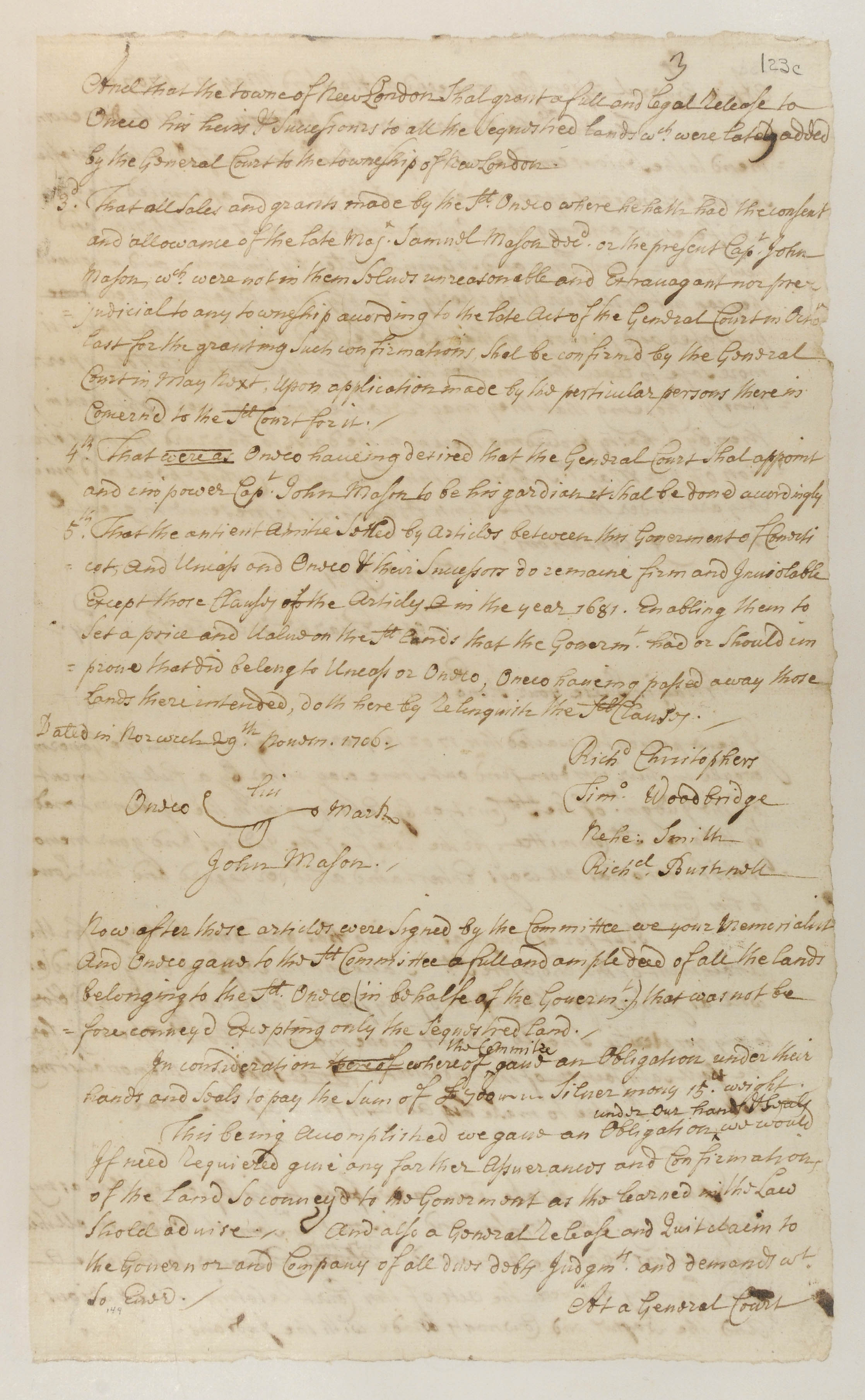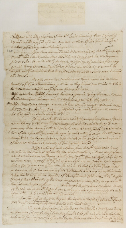 Government -- Colonial -- Colony of Connecticut -- Commissioners for Trade and Plantations; Government -- Colonial -- Colony of Connecticut -- General Assembly; Government -- Tribal -- Mohegan -- Sachems/Sagamores -- Owaneco (1683-1715); Government -- Tribal -- Mohegan -- Sachems/Sagamores -- Uncas (1638-1683); Land -- Complaints -- Controversies -- Mohegan Case; Land -- Complaints -- Encroachment -- Neighbors; Land -- Conveyances; Land -- Description -- Boundaries; Land -- Reservation/Reserve -- Mohegan; Landforms -- Aquatic -- Rivers -- Connecticut; Landforms -- Aquatic -- Rivers -- Thames; Law -- Imperial Actions -- Case Names -- Mohegan Case; Law -- Imperial Actions -- Privy Council -- Civil Appeals; Relations -- Colonial Affairs; Relations -- Tribal Affairs; Tribes/Communities -- Mohegan; Tribes/Communities -- Narragansett; YIPP -- Colony of Connecticut Collection, 1603-1783