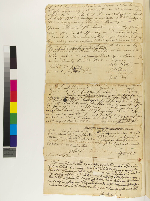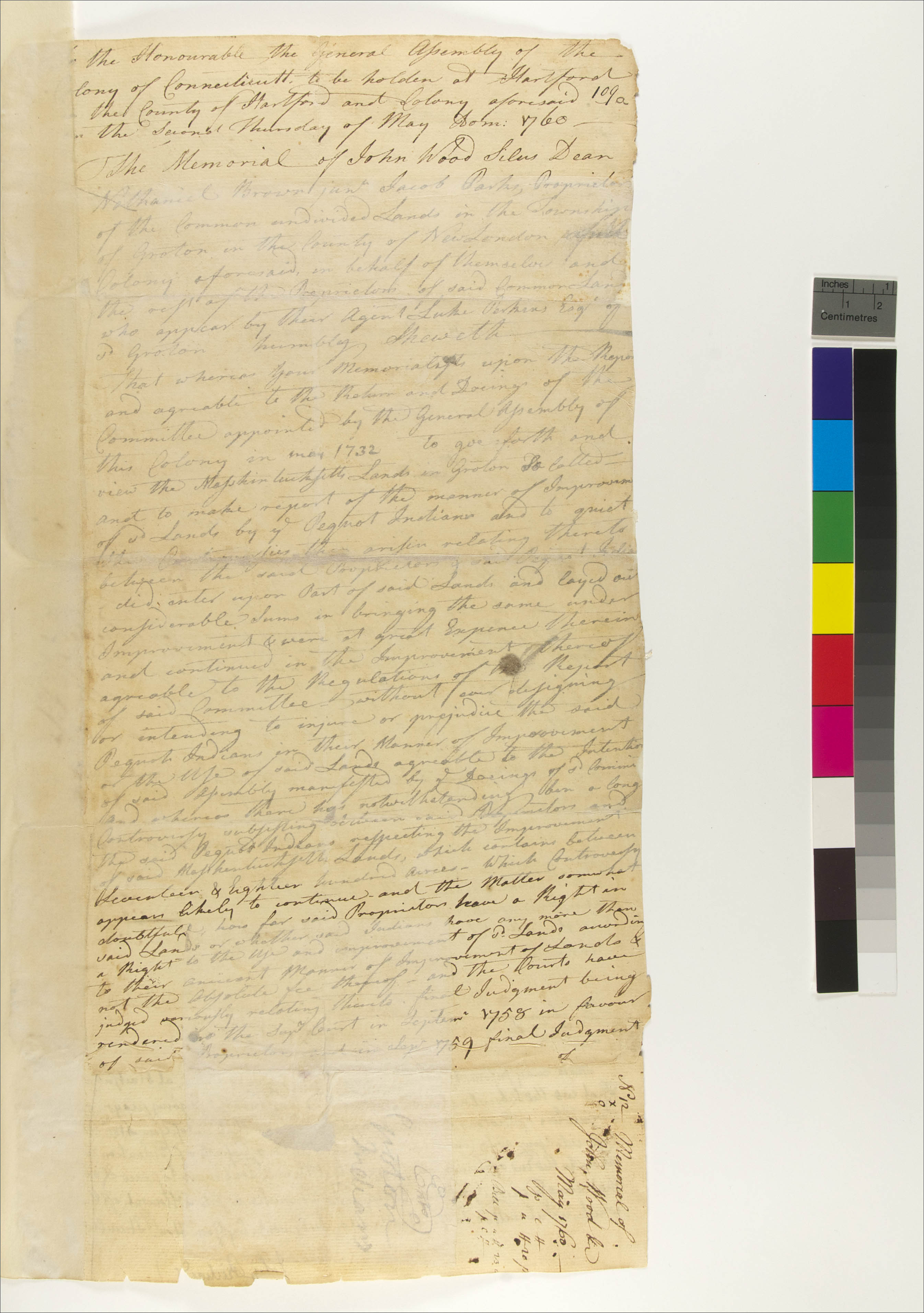 Government -- Colonial -- Colony of Connecticut -- General Assembly -- Committees; Government -- Colonial -- Colony of Connecticut -- General Assembly; Government -- Colonial -- Colony of Connecticut -- Superior Court; Government -- Tribal -- Pequot -- Western; Land -- Common -- Division; Land -- Complaints -- Controversies; Land -- Reservation/Reserve -- Pequot -- Western; Land -- Use -- Improvement; Law -- Civil Actions -- Procedure -- Service of Process; Law -- Legislative Process -- Petitions -- Accepted; Relations -- Colonial Affairs; Relations -- Tribal Affairs; Tribes/Communities -- Pequot -- Western; YIPP -- Colony of Connecticut Collection, 1603-1783