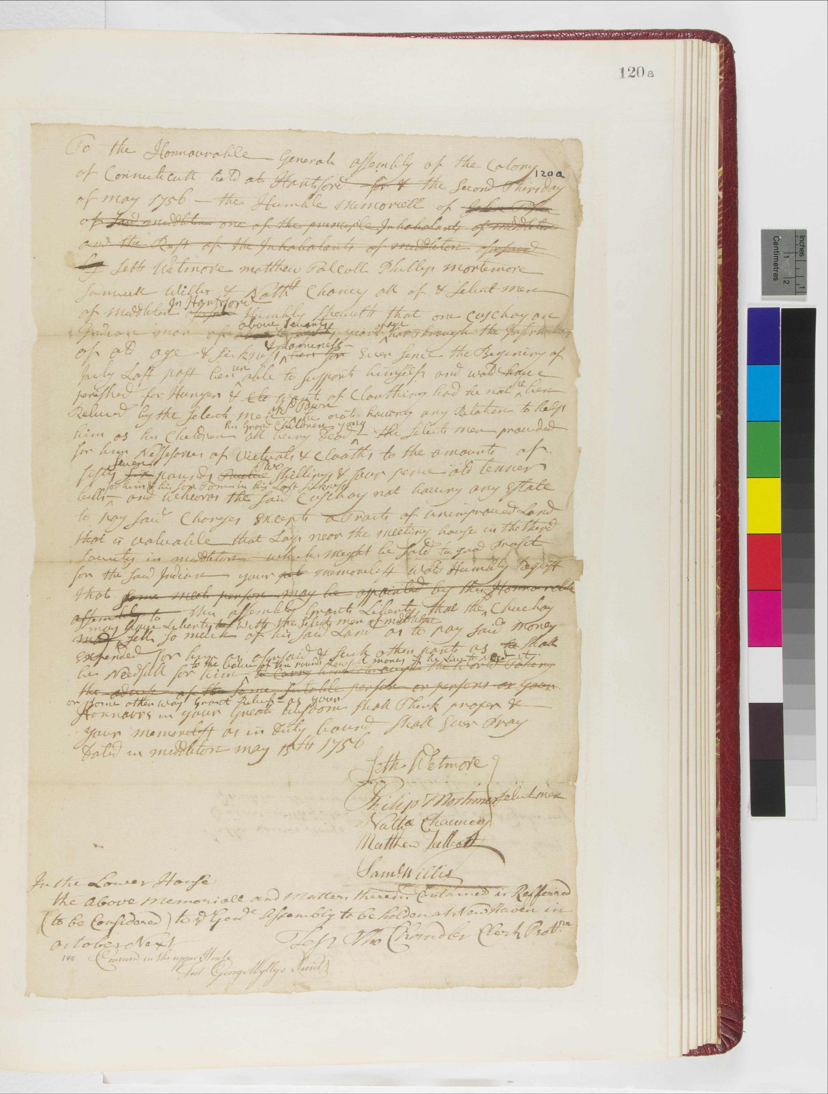 Chandler, Thomas (Attestor); Chauncey, Elihu (Attestor); Chauncey, Nathaniel (Mentioned within document); Connecticut General Assembly (Recipient); Coschoy (Mentioned within document); Mortimer, Philip (Mentioned within document); Talcott, Matthew (Mentioned within document); Wetmore, Seth (Mentioned within document); Willis, Samuel (Mentioned within document); Wyllys, George, 1710-1796 (Attestor)