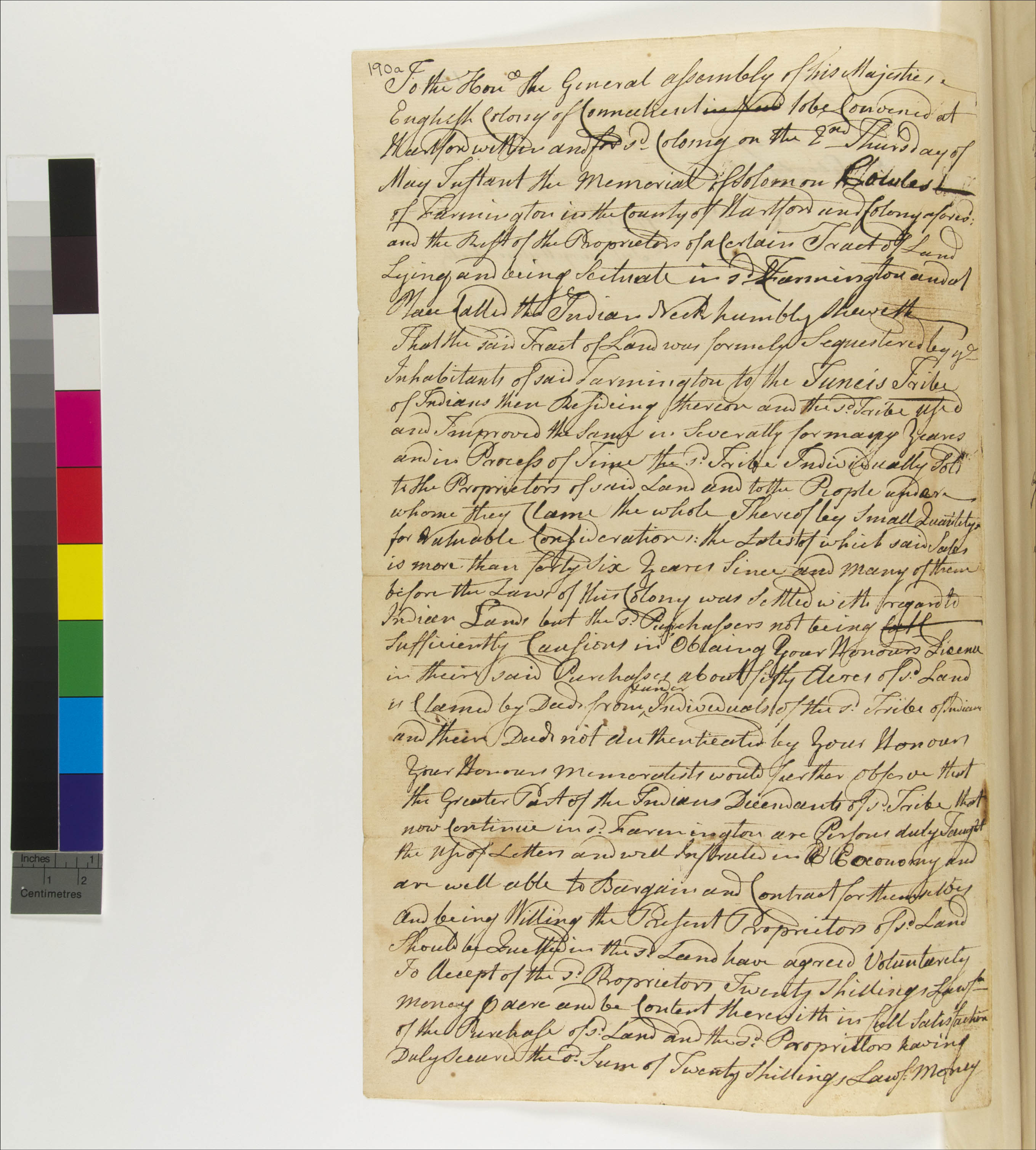 Abstract Ideas -- Civilization; Education/Schools -- Literacy; Government -- Colonial -- Colony of Connecticut -- General Assembly -- Committees; Government -- Colonial -- Colony of Connecticut -- General Assembly; Government -- Colonial -- Colony of Connecticut -- Guardians/Overseers; Government -- Tribal -- Tunxis; Land -- Common -- Division; Land -- Conveyances -- Sale -- Request; Land -- Conveyances -- Sale; Land -- Reservation/Reserve -- Tunxis; Land -- Use -- Improvement; Law -- Civil Actions -- Case Names -- Solomon Cowles v. Tunxis Indians; Law -- Legislative Process -- Petitions -- Accepted; Law -- Property; Relations -- Colonial Affairs; Relations -- Tribal Affairs; Tribes/Communities -- Tunxis; YIPP -- Colony of Connecticut Collection, 1603-1783