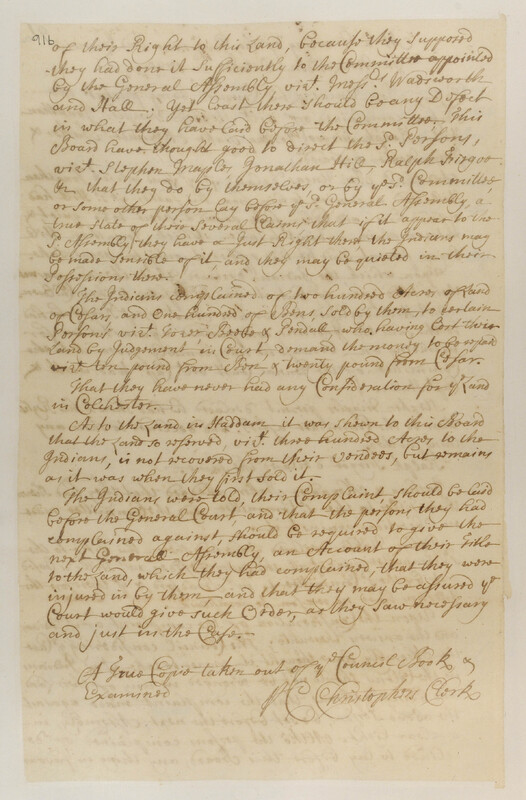 Government -- Colonial -- Colony of Connecticut -- General Assembly; Government -- Tribal -- Mohegan -- Pro-Government Faction -- Sachems/Sagamores -- Major Ben Uncas I (1723-1725); Government -- Tribal -- Mohegan -- Sachems/Sagamores -- Cesar (1715-1723); Land -- Complaints -- Controversies -- Mohegan Case; Land -- Complaints -- Encroachment -- Neighbors; Land -- Description -- Boundaries; Land -- Reservation/Reserve -- Mohegan; Law -- Imperial Actions -- Case Names -- Mohegan Case; Law -- Imperial Actions -- Privy Council -- Civil Appeals; Relations -- Colonial Affairs; Relations -- Tribal Affairs; Tribes/Communities -- Mohegan; YIPP -- Colony of Connecticut Collection, 1603-1783