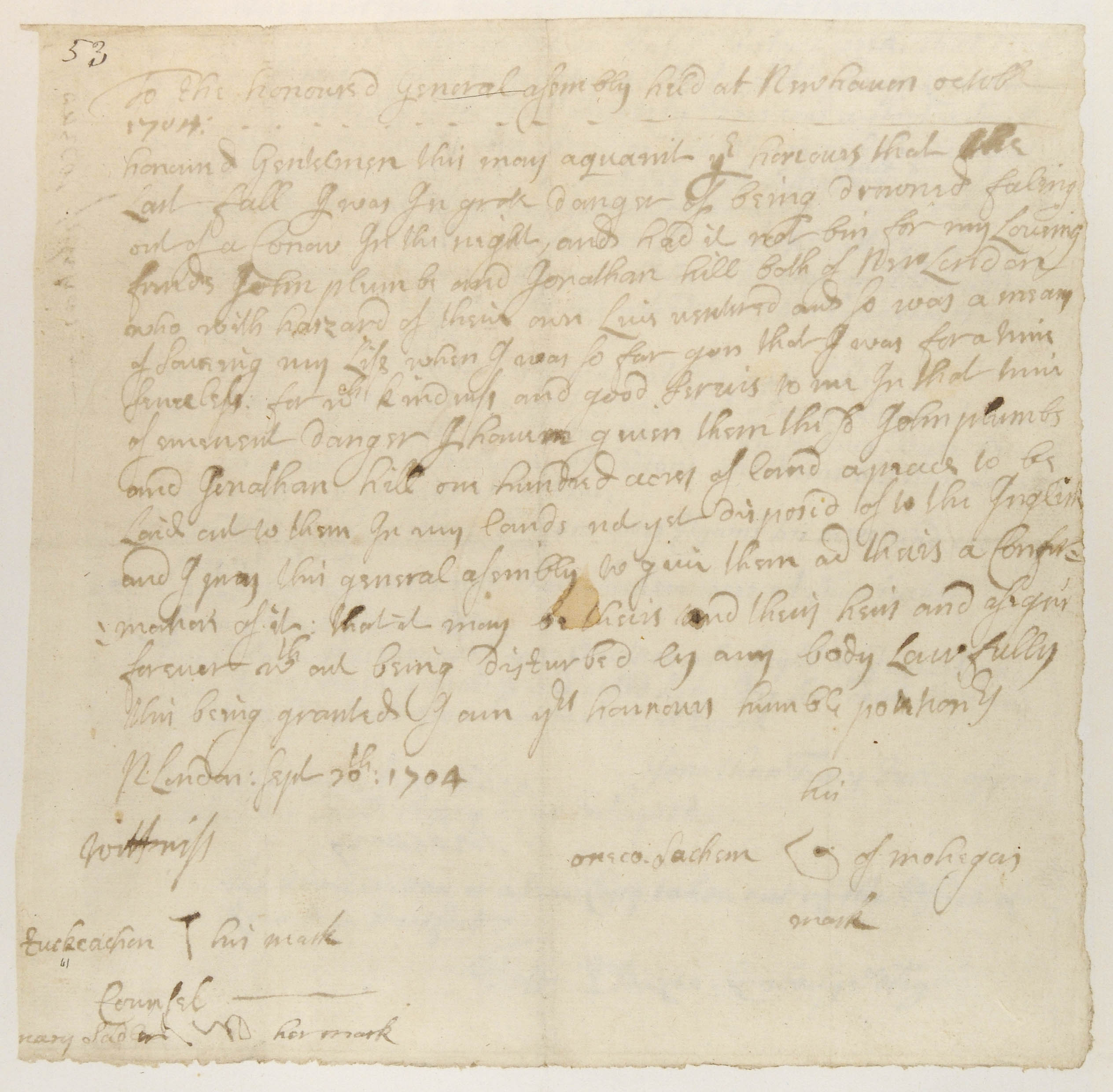 Petition from Owaneco, September 30, 1704, (1704.09.20.00), Grant-Costa, Paul, et. al., eds., Yale Indian Papers Project, Yale University, http://jake.library.yale.edu:8080/neips/data/html/1704.09.20.00/1704.09.20.00.html.