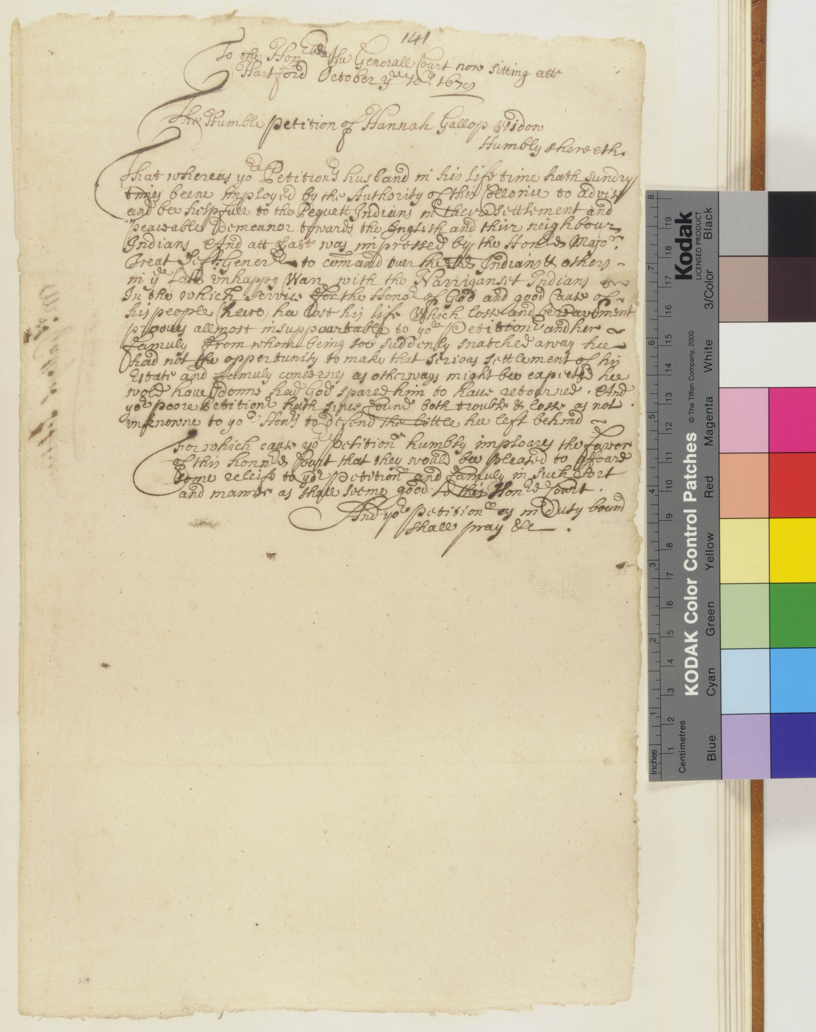Connecticut General Court (Recipient); Gallup, John, -1675 (Mentioned within document); Lake, Hannah (Mentioned within document); Palmes, Edward (Mentioned within document); Treat, Robert, Sr., 1624-1710 (Mentioned within document)
