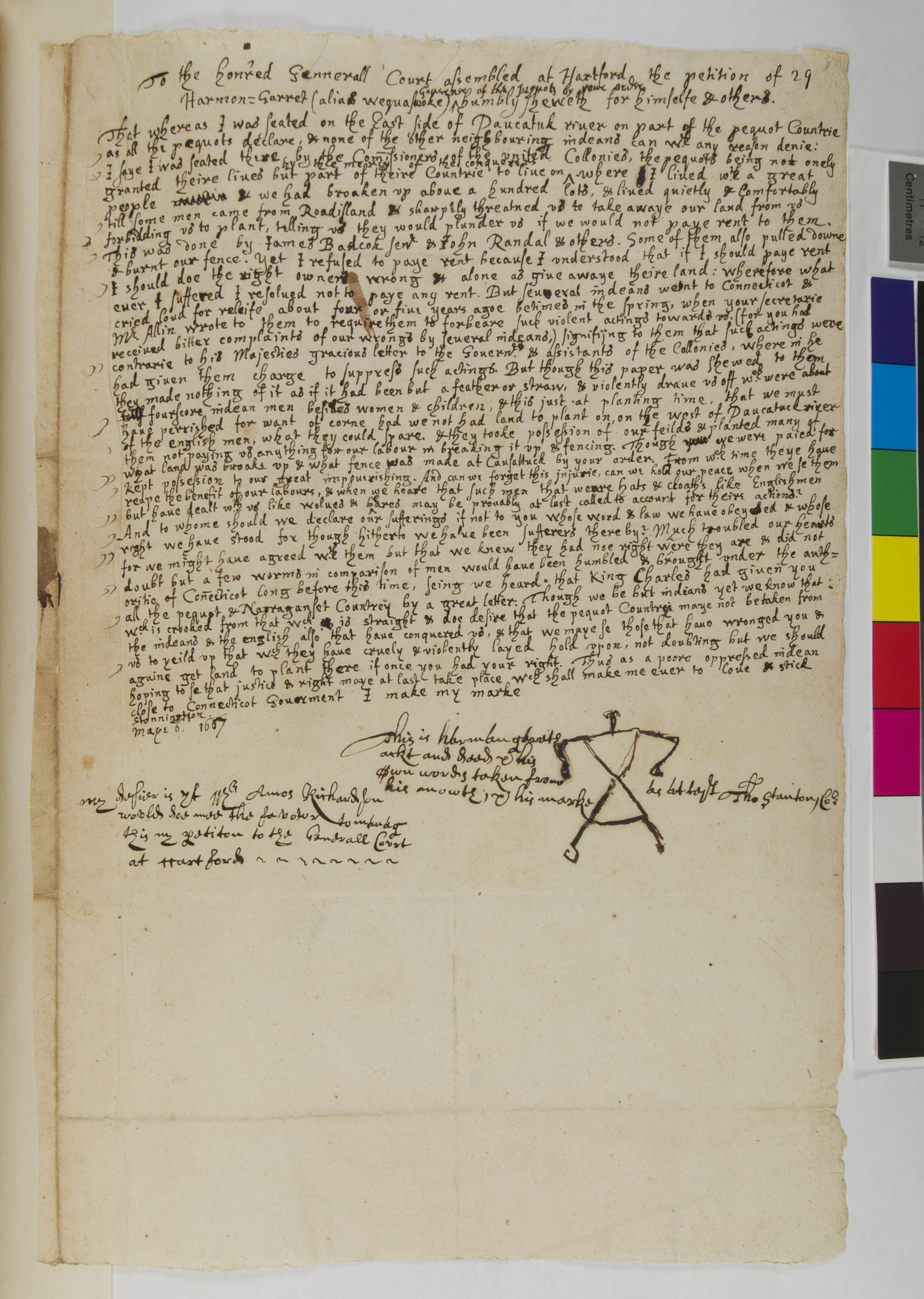 Abstract Ideas -- Conquest; Abstract Ideas -- Fidelity; Abstract Ideas -- Savageness; Culture -- Clothing/Dress; Government -- Colonial -- Colony of Connecticut -- General Court; Government -- Colonial -- United Colonies -- Commissioners; Government -- Tribal -- Pequot -- Eastern -- Sachems/Sagamores -- Cashawashett (Wequashcook II, Harman Garrett)(1655-1678); Land -- Common -- Division; Land -- Complaints -- Controversies; Land -- Complaints -- Ejectment; Land -- Complaints -- Encroachment -- Neighbors; Land -- Complaints -- Trespass; Land -- Complaints -- Vandalism; Land -- Use -- Tenancy; Landforms -- Terrestrial -- Fields; Law -- Charters/Patents; Law -- Imperial -- Charters/Patents; Military -- War -- Pequot War (1636-1638); Relations -- Colonial Affairs; Relations -- Intercolonial; Relations -- Tribal Affairs; Relations -- Violence; Tribes/Communities -- Pequot -- Eastern; Tribes/Communities -- Pequot; YIPP -- Colony of Connecticut Collection, 1603-1783; YIPP -- Colony of Rhode Island Collection, 1600-1783