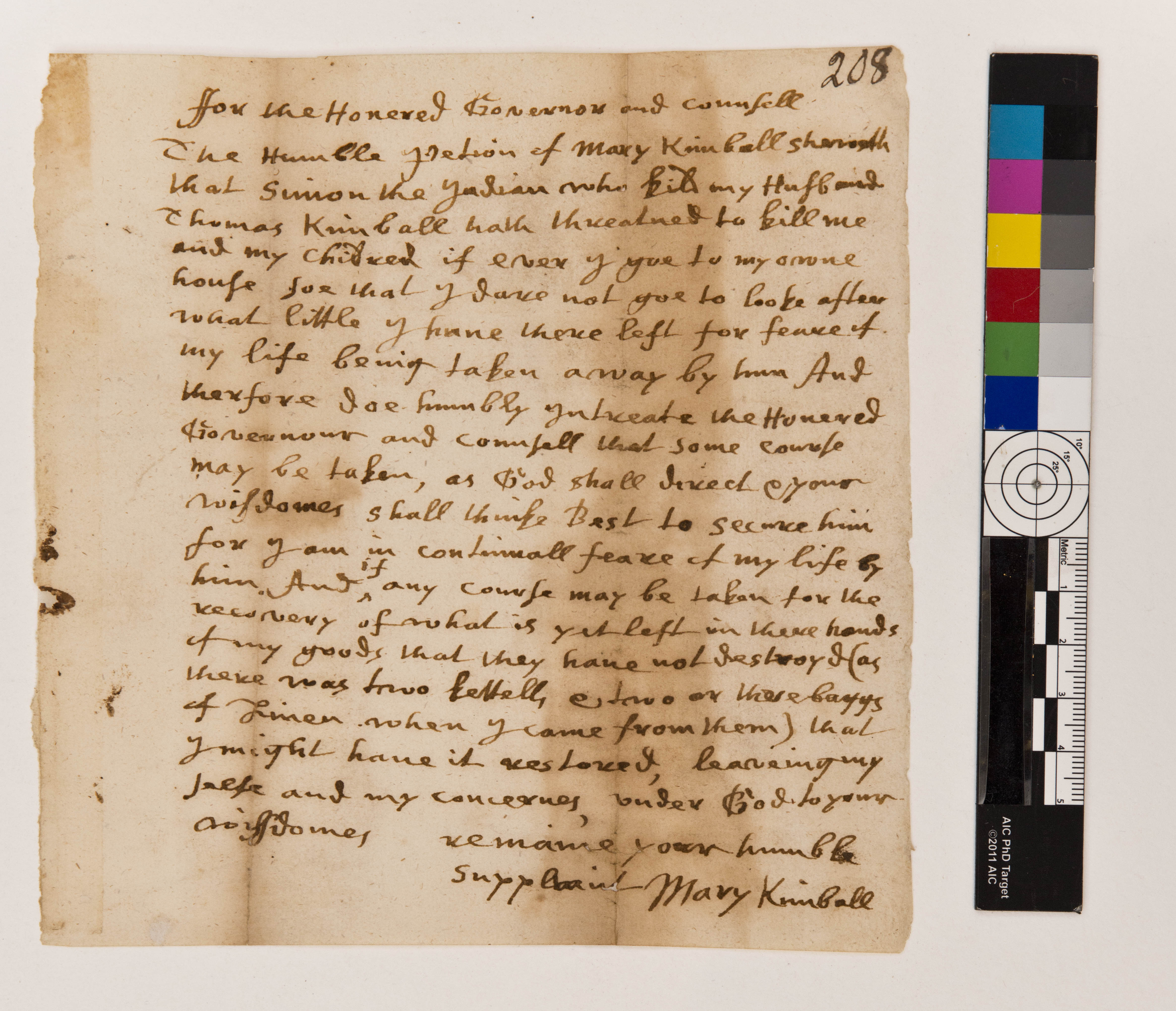 Petition of Mary Kimball to the Massachusetts Council, August 1, 1676, (1676.08.01.00), Grant-Costa, Paul, et. al., eds., Yale Indian Papers Project, Yale University, http://jake.library.yale.edu:8080/neips/data/html/1676.08.01.00/1676.08.01.00.html.
