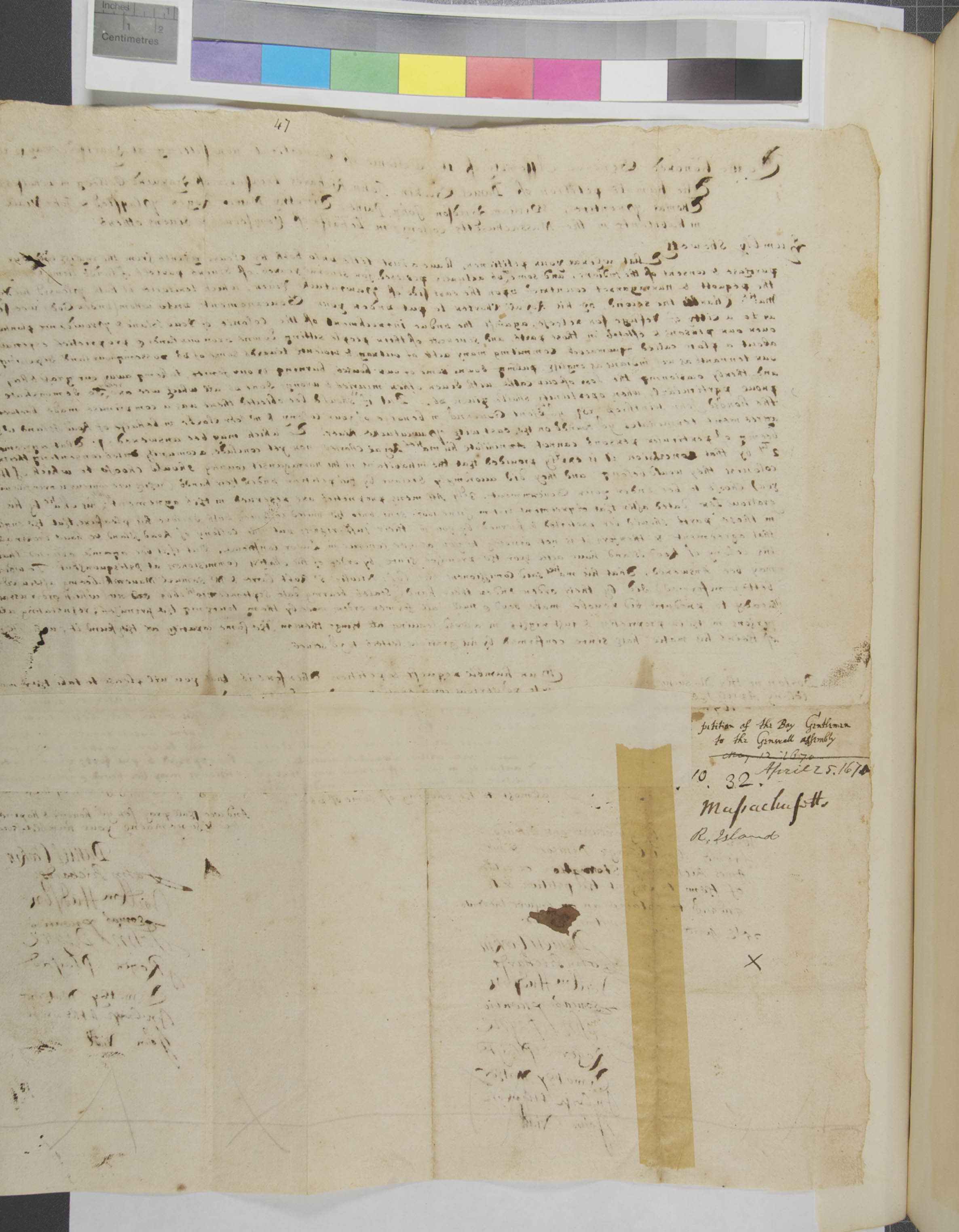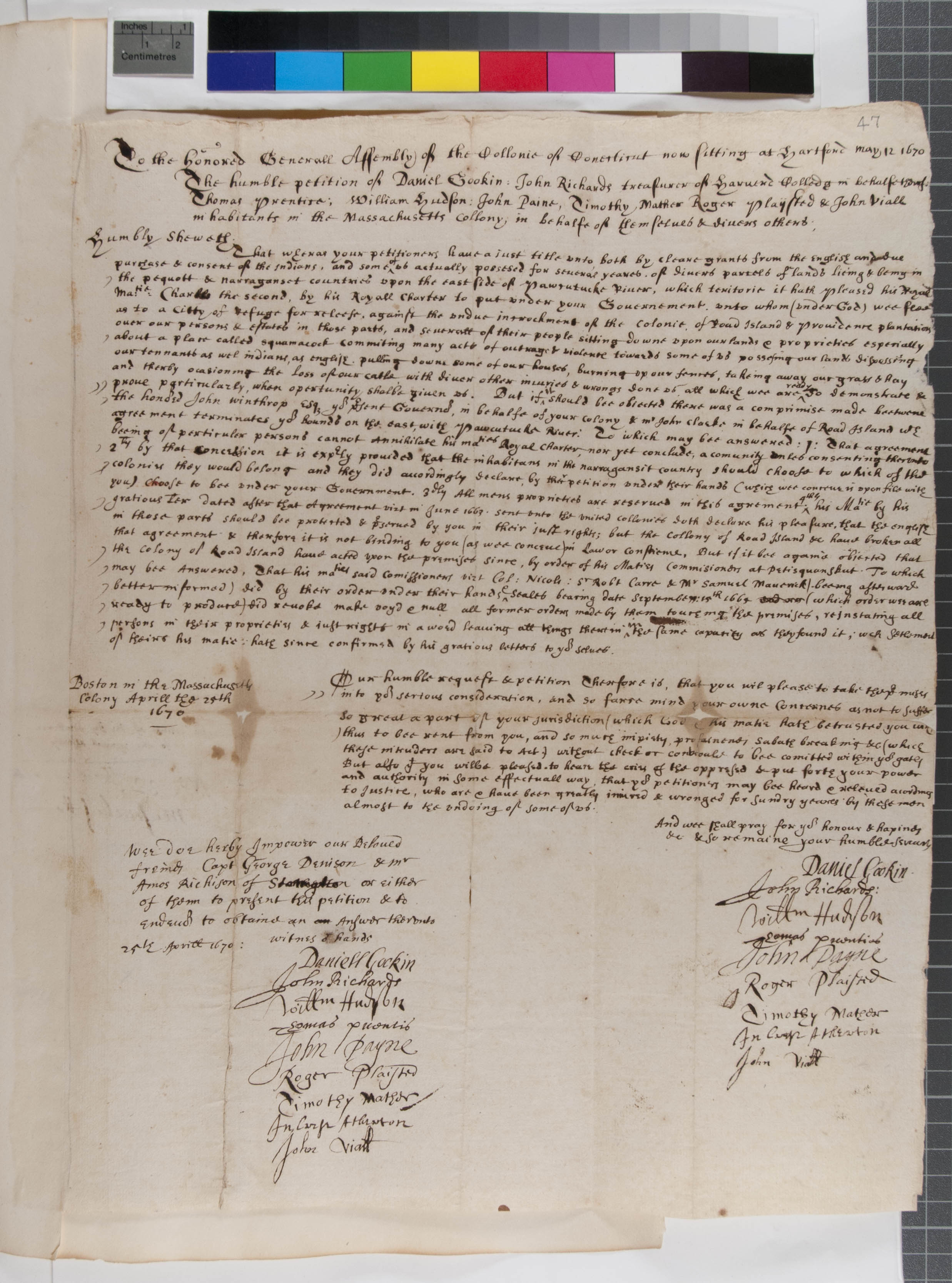 Government -- Colonial -- Colony of Connecticut -- General Assembly; Government -- Colonial -- United Colonies -- Commissioners; Government -- Imperial -- Agencies -- King's Commissioners; Land -- Complaints -- Ejectment; Land -- Complaints -- Encroachment; Land -- Complaints -- Vandalism; Land -- Conveyances -- Grants; Land -- Use -- Improvement -- Fences; Land -- Use -- Improvement -- Husbandry/Livestock; Land -- Use -- Tenancy; Law -- Charters/Patents; Law -- Imperial -- Charters/Patents; Law -- Jurisdiction; Law -- Legislative Process -- Petitions; Relations -- Colonial Affairs; Relations -- Intercolonial; Relations -- Tribal Affairs; Religion/Beliefs -- Blasphemy -- Profanity; Religion/Beliefs -- Blasphemy; Tribes/Communities -- Narragansett; Tribes/Communities -- Pequot -- Eastern; YIPP -- Colony of Connecticut Collection, 1603-1783; YIPP -- Colony of Rhode Island Collection, 1600-1783