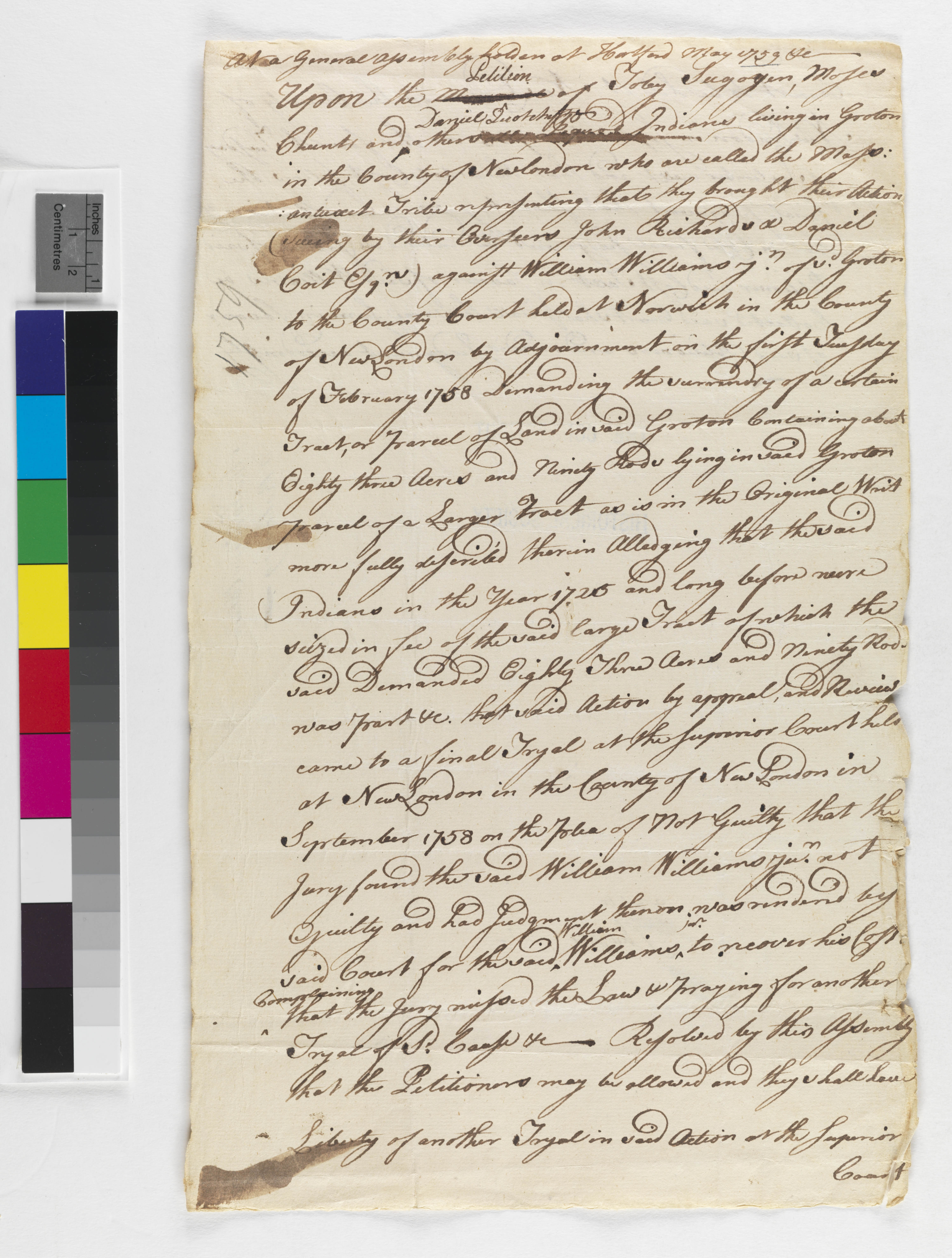 Government -- Colonial -- Colony of Connecticut -- Guardians/Overseers; Government -- Tribal -- Pequot -- Western; Land -- Complaints -- Boundary Disputes; Land -- Reservation/Reserve -- Pequot -- Western; Law -- Civil Actions -- Case Names -- Pequot v. William Williams, Jr; Law -- Civil Actions -- Procedure -- Appeals; Law -- Civil Actions -- Procedure -- Resolve; Law -- Civil Actions -- Property Issues -- Title/Ownership; Relations -- Colonial Affairs; Relations -- Tribal Affairs; Repository -- Connecticut Historical Society; Tribes/Communities -- Pequot -- Western; YIPP -- Colony of Connecticut Collection, 1603-1783