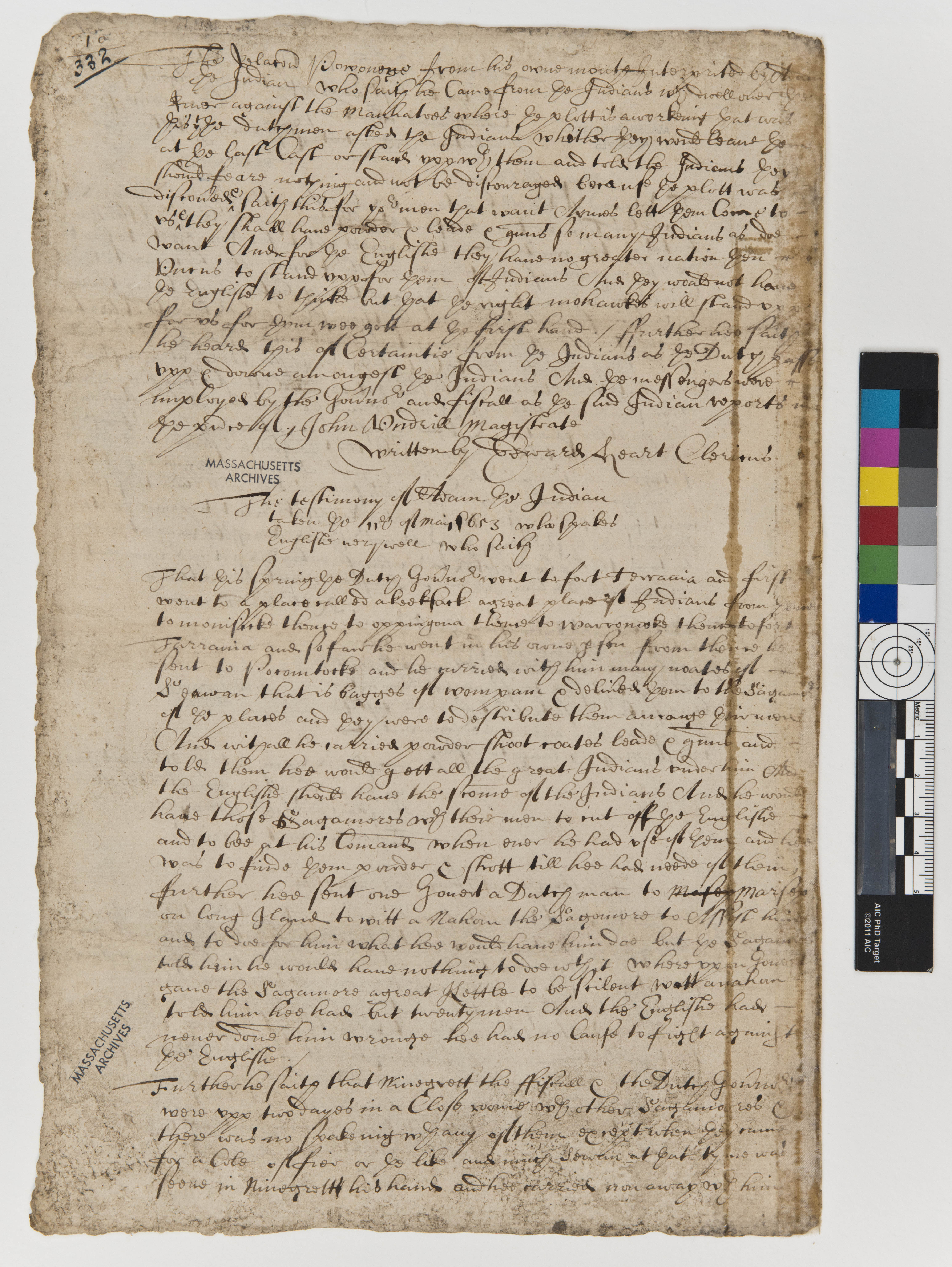 Hart, Edward (Attestor); Stuyvesant, Peter, 1612-1672 (Mentioned within document); Uncas, 1590-1683 (Mentioned within document); Underhill, John (Mentioned within document); Unknown (Recipient); Van Dyke, Hendrick (ffiscal) (Mentioned within document)