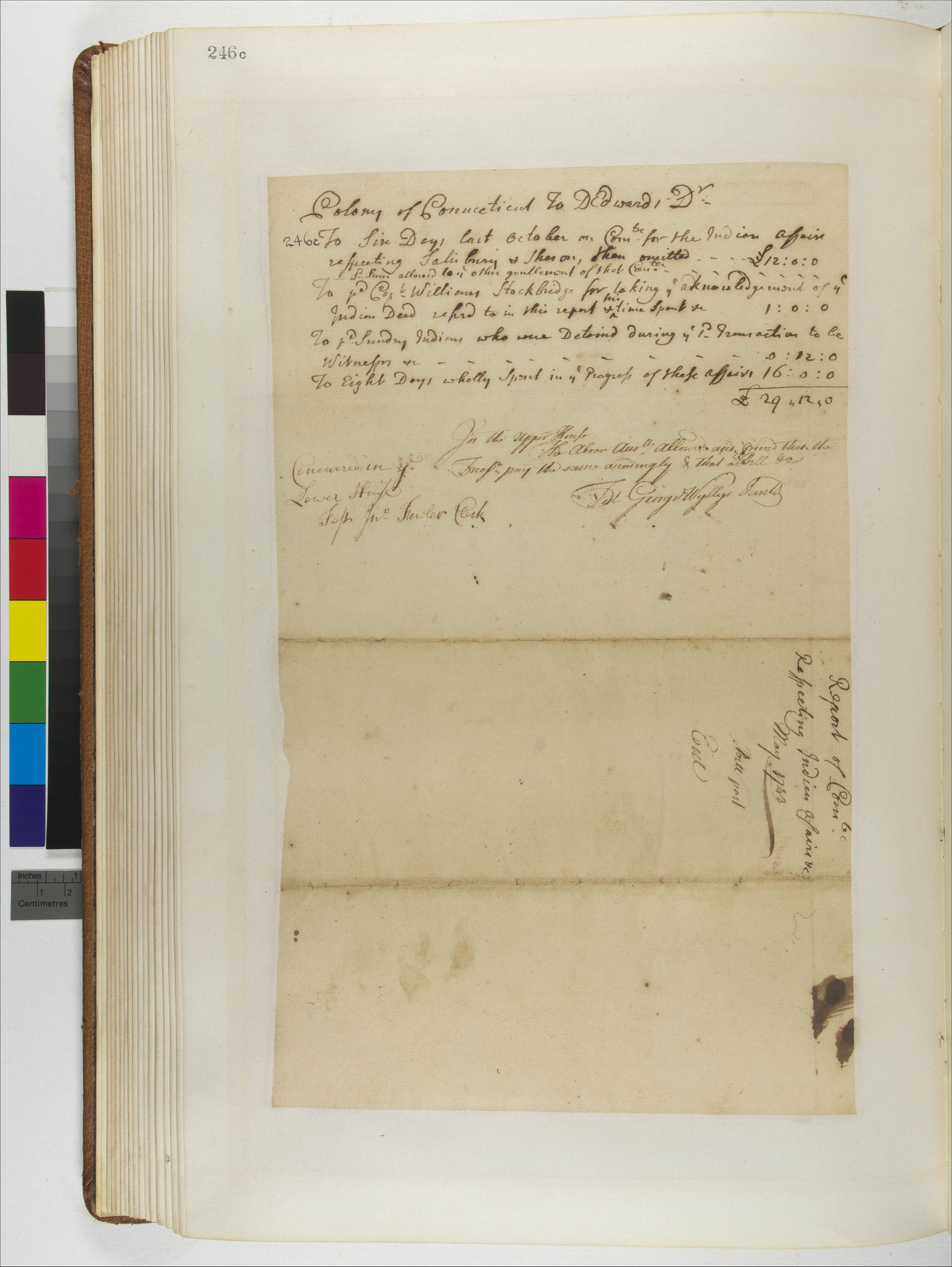 Accounting/Finance -- Debt; Commerce/Trade -- Blankets; Culture -- Children; Culture -- Elders; Culture -- Family; Culture -- Genealogy; Culture -- Gift; Culture -- Inheritance; Culture -- Language -- interpreter; Education/Schools -- Missions -- Connecticut -- Sharon; Education/Schools -- Missions -- Massachusetts -- Stockbridge -- Timothy Woodbridge (1743); Government -- Colonial -- Colony of Connecticut -- General Assembly; Government -- Tribal -- Sharon Indians; Government -- Tribal -- Stockbridge; Land -- Complaints -- Removal/Relocation -- Stockbridge; Land -- Conveyances -- Deed/Title; Land -- Reservation/Reserve -- Sharon Indians; Land -- Use -- Improvement; Land -- Use -- Timber/Firewood; Law -- Legislative Process -- Reports -- Accepted; Relations -- Colonial Affairs; Relations -- Tribal Affairs; Religion/Beliefs -- Christianity -- Missions/Praying Towns -- Connecticut -- Sharon -- Peter Pratt (1743 ) missionary; Travel; Tribes/Communities -- Salisbury; Tribes/Communities -- Sharon Indians; Tribes/Communities -- Stockbridge; YIPP -- Colony of Connecticut Collection, 1603-1783