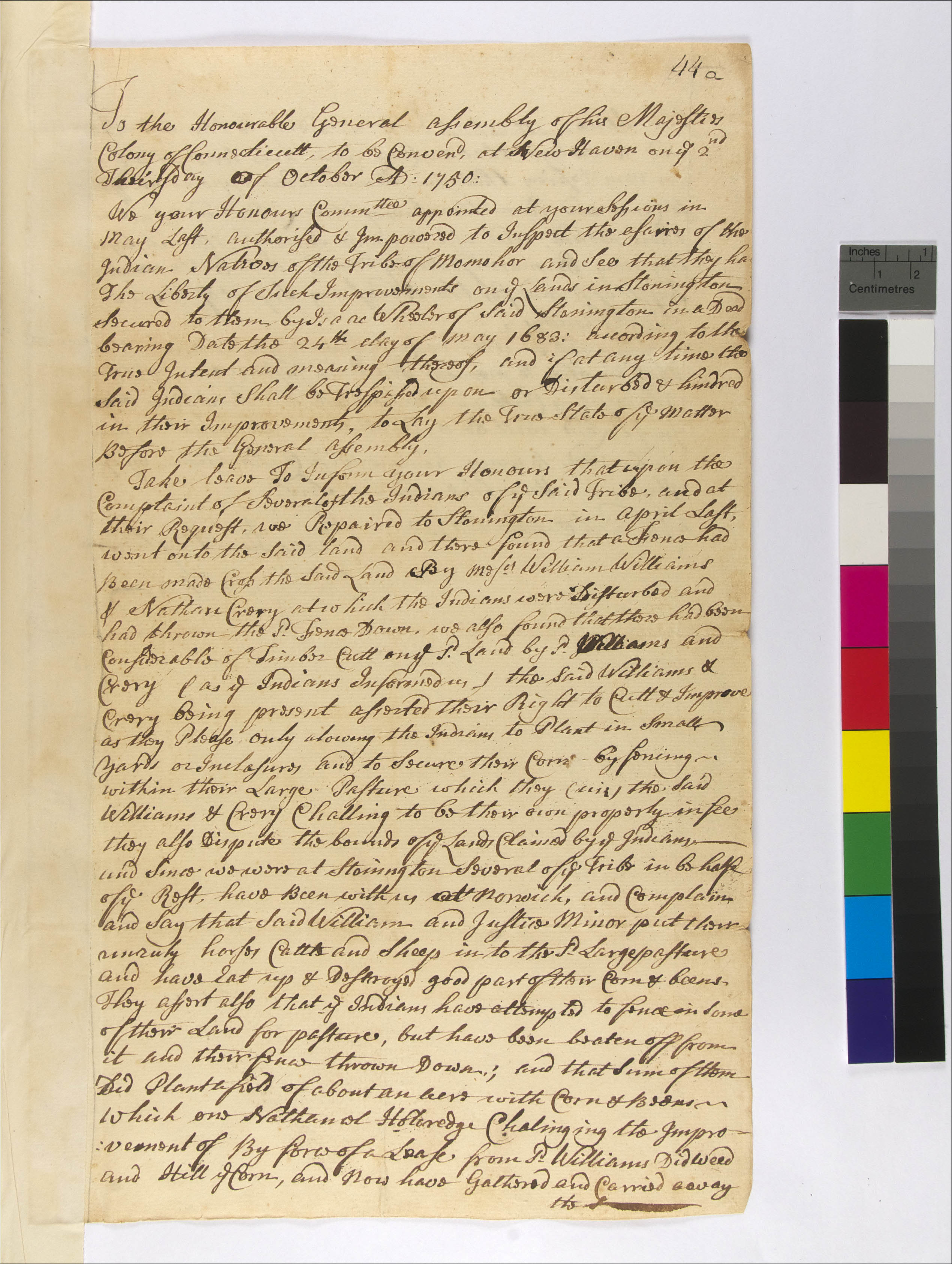 Animals -- Cattle; Animals -- Sheep; Government -- Colonial -- Colony of Connecticut -- General Assembly; Government -- Tribal -- Pequot -- Eastern -- Sachems/Sagamores -- Mary Mamoho (1749-1751); Government -- Tribal -- Pequot -- Eastern -- Sachems/Sagamores -- Various Pequot Headmen (c.1750-1783); Land -- Complaints -- Encroachment -- Animal; Land -- Complaints -- Encroachment -- Neighbors; Land -- Conveyances -- Deed/Title; Land -- Description -- Boundaries; Land -- Reservation/Reserve -- Pequot -- Eastern; Land -- Use -- Improvement -- Agriculture -- Damage to; Land -- Use -- Improvement -- Agriculture -- Harvest; Land -- Use -- Improvement -- Fences; Land -- Use -- Improvement -- Husbandry/Livestock; Land -- Use -- Improvement -- Pasture; Land -- Use -- Timber/Firewood; Relations -- Colonial Affairs; Relations -- Tribal Affairs; Tribes/Communities -- Pequot -- Eastern; YIPP -- Colony of Connecticut Collection, 1603-1783