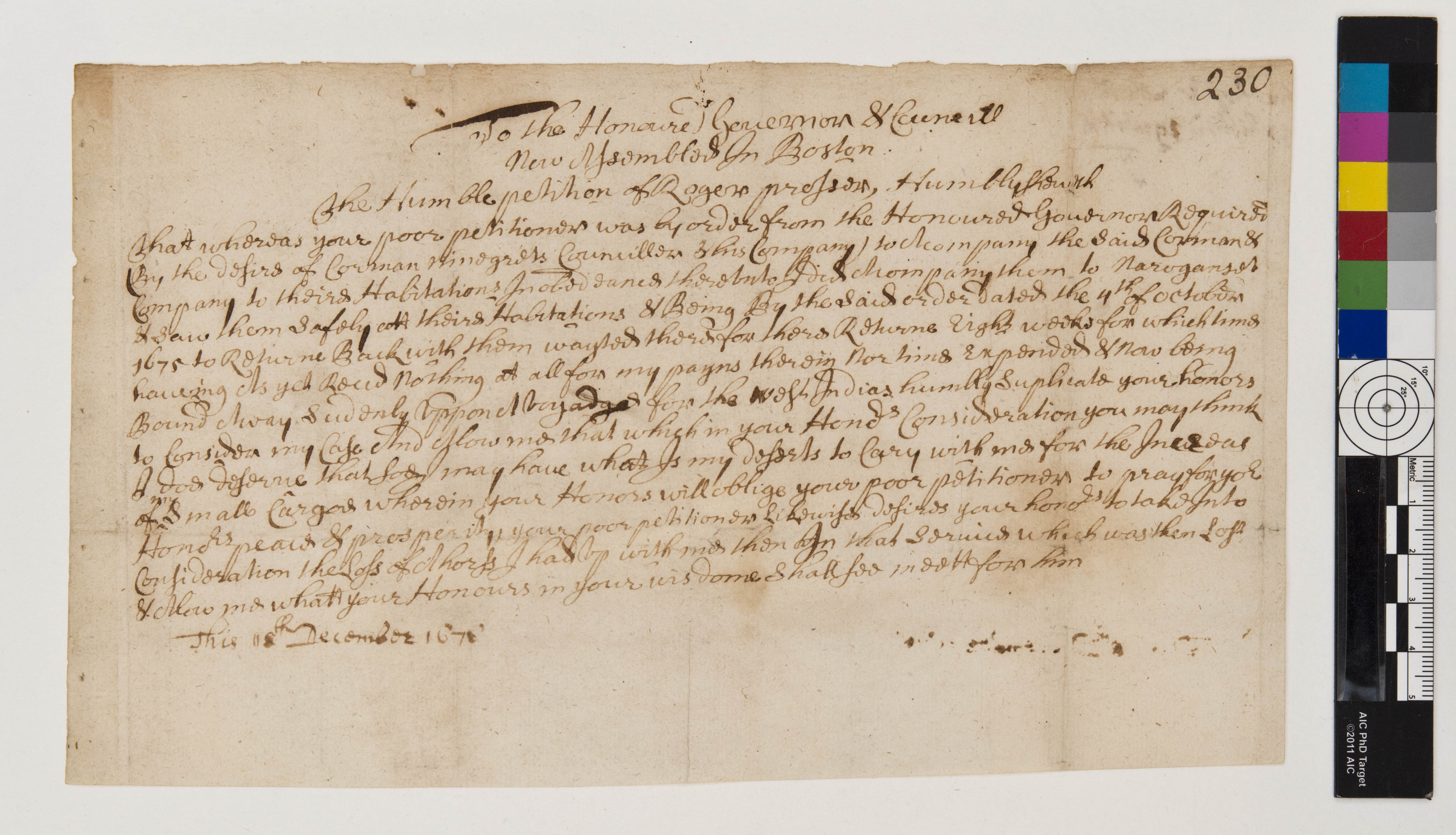 Roger Prosser's Petition to the Massachusetts Governor and Council, December 8, 1676, (1676.12.11.00), Grant-Costa, Paul, et. al., eds., Yale Indian Papers Project, Yale University, http://jake.library.yale.edu:8080/neips/data/html/1676.12.11.00/1676.12.11.00.html.