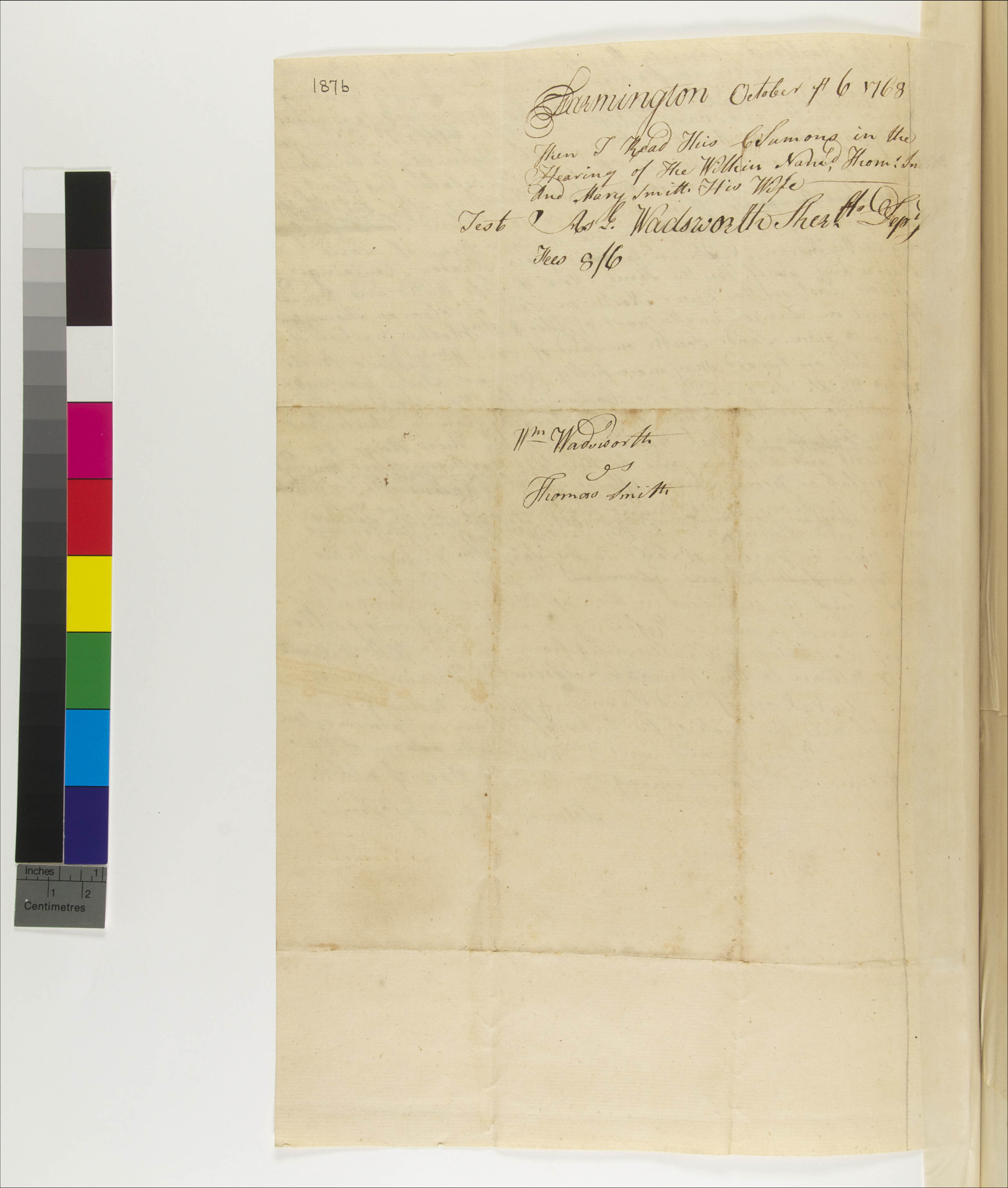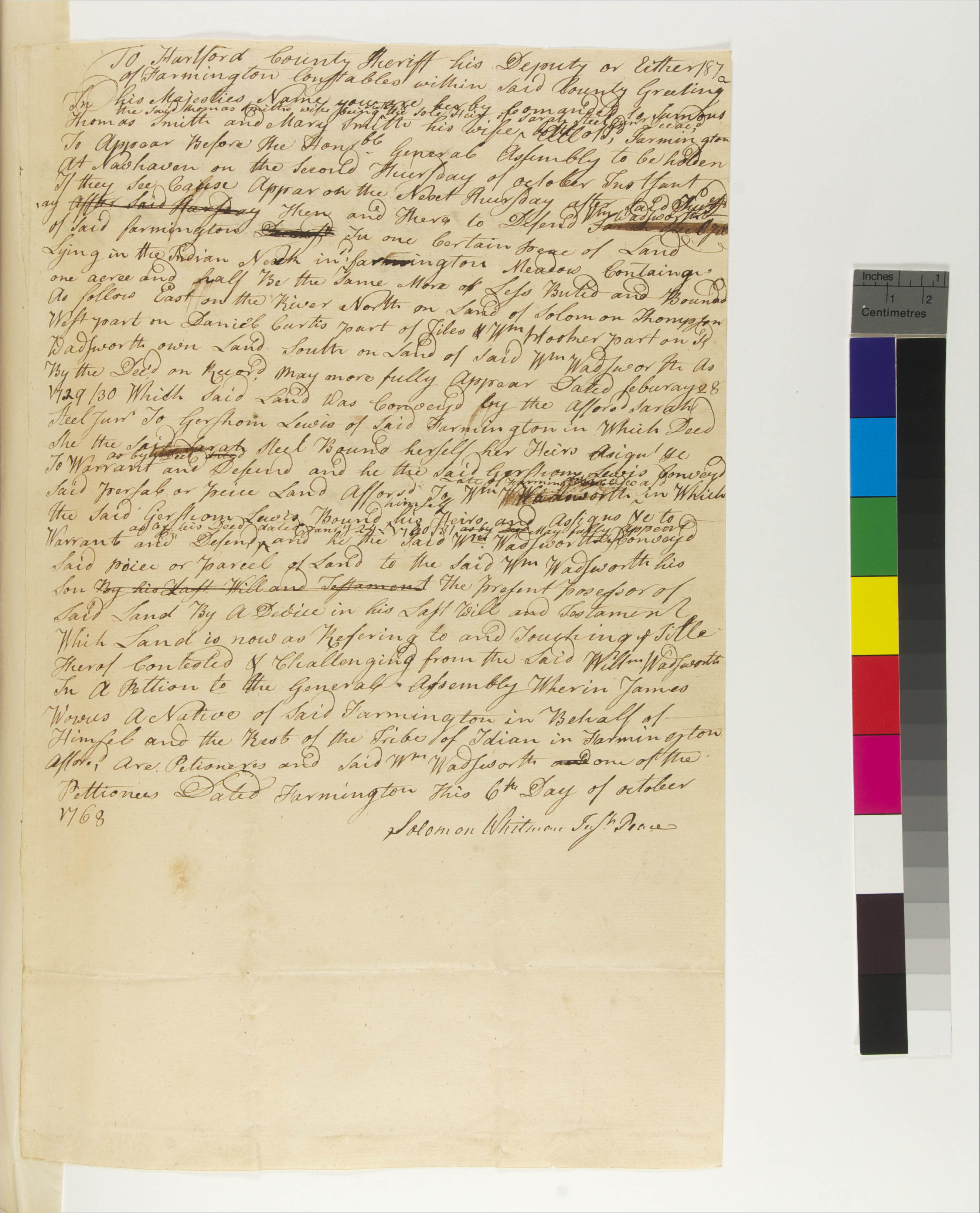 Government -- Colonial -- Colony of Connecticut -- General Assembly; Government -- Tribal -- Tunxis; Land -- Complaints -- Controversies; Land -- Conveyances -- Deed/Title; Land -- Conveyances; Land -- Description -- Boundaries; Land -- Reservation/Reserve -- Tunxis; Law -- Civil Actions -- Case Names -- William Wadsworth v. Thomas Smith; Law -- Civil Actions -- Procedure -- Service of Process; Relations -- Colonial Affairs; Relations -- Tribal Affairs; Tribes/Communities -- Tunxis; YIPP -- Colony of Connecticut Collection, 1603-1783