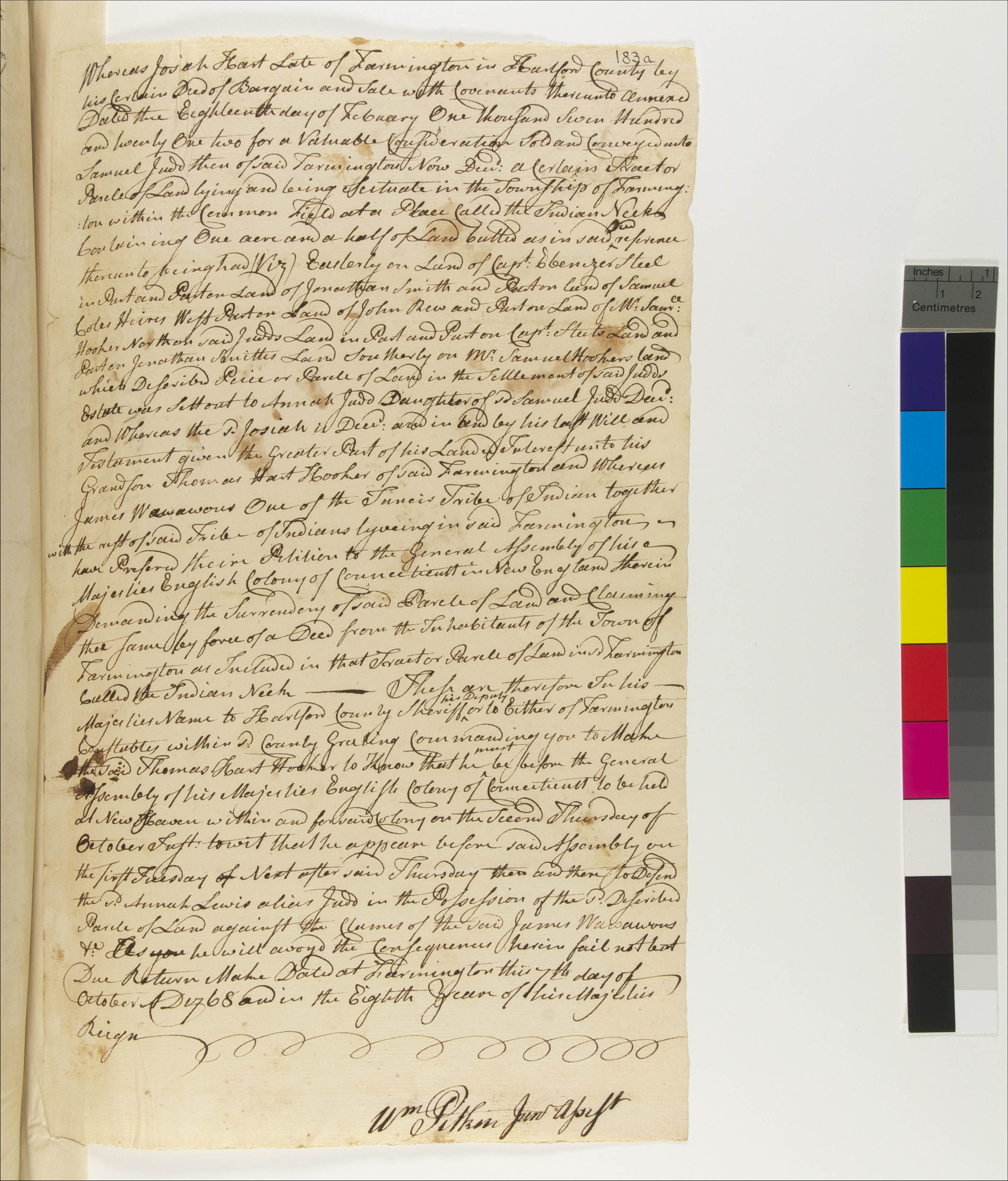 Government -- Colonial -- Colony of Connecticut -- General Assembly; Government -- Tribal -- Tunxis; Land -- Complaints -- Controversies; Land -- Conveyances -- Deed/Title; Land -- Conveyances; Land -- Description -- Boundaries; Land -- Reservation/Reserve -- Tunxis; Law -- Civil Actions -- Case Names -- Annah Lewis Judd v. Thomas Hart Hooker; Law -- Civil Actions -- Procedure -- Service of Process; Relations -- Colonial Affairs; Relations -- Tribal Affairs; Tribes/Communities -- Tunxis; YIPP -- Colony of Connecticut Collection, 1603-1783