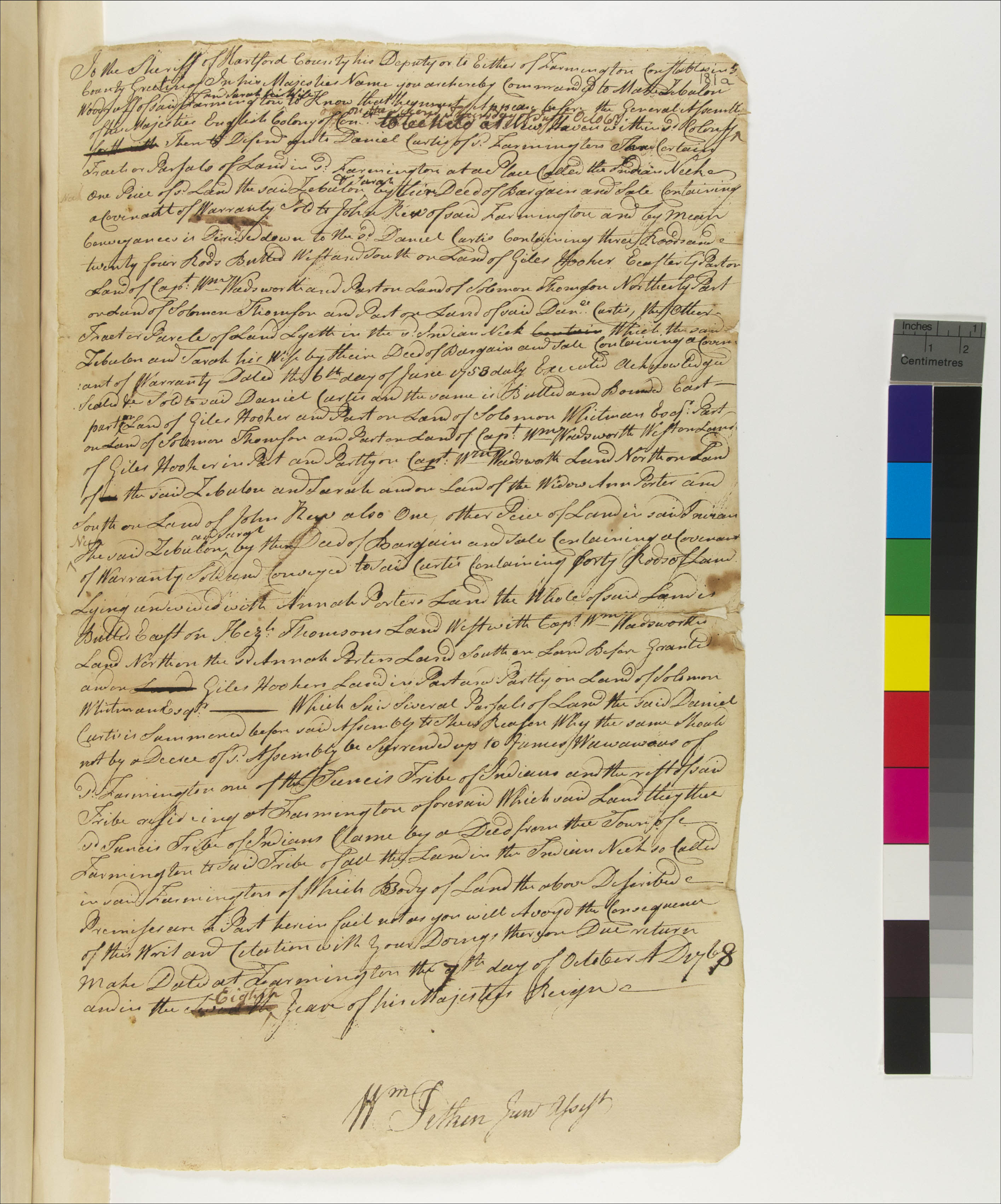 Government -- Colonial -- Colony of Connecticut -- General Assembly; Government -- Tribal -- Tunxis; Land -- Complaints -- Controversies; Land -- Conveyances -- Deed/Title; Land -- Conveyances; Land -- Description -- Boundaries; Land -- Reservation/Reserve -- Tunxis; Law -- Civil Actions -- Case Names -- Daniel Curtiss v. Zebulon & Sarah Woodruff; Law -- Civil Actions -- Procedure -- Service of Process; Relations -- Colonial Affairs; Relations -- Tribal Affairs; Tribes/Communities -- Tunxis; YIPP -- Colony of Connecticut Collection, 1603-1783