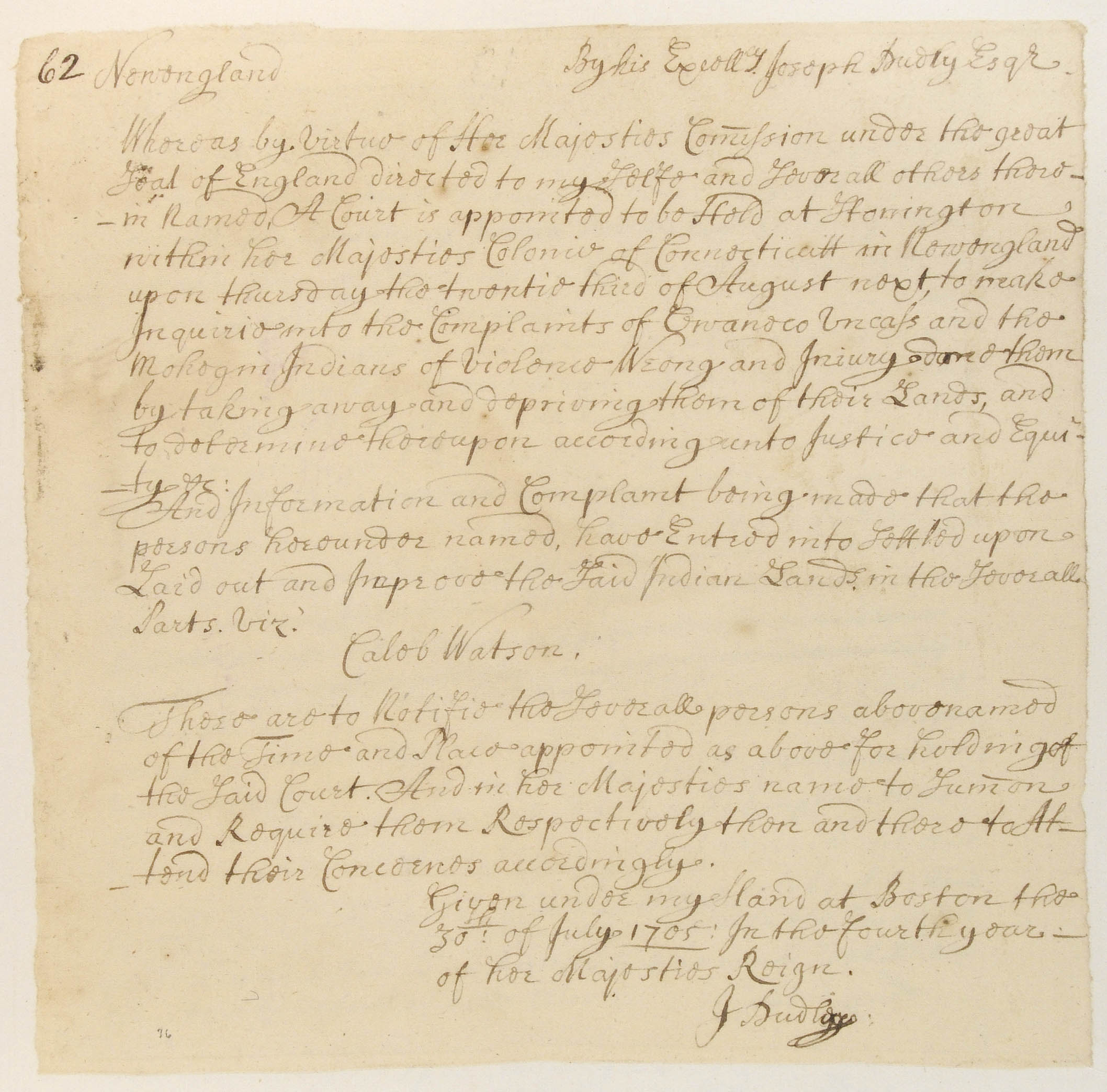 Summons of Caleb Watson, July 30, 1705, (1705.07.30.00), Grant-Costa, Paul, et. al., eds., Yale Indian Papers Project, Yale University, http://jake.library.yale.edu:8080/neips/data/html/1705.07.30.00/1705.07.30.00.html.