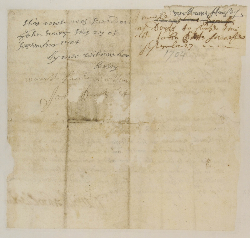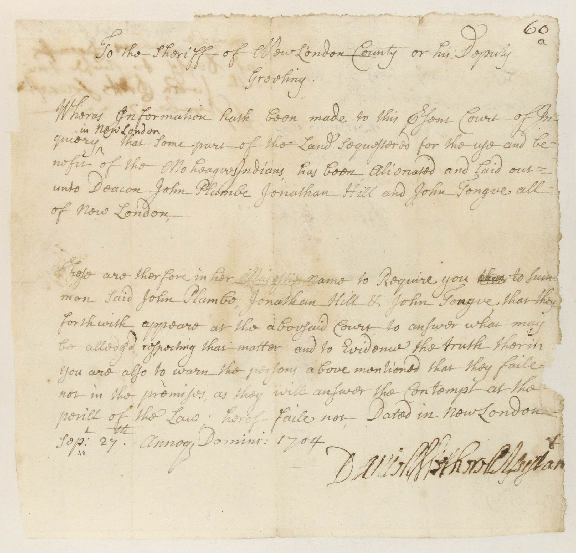 Summons of John Plumb, Jonathan Hill and John Tongue, September 27, 1704, (1704.09.27.00), Grant-Costa, Paul, et. al., eds., Yale Indian Papers Project, Yale University, http://jake.library.yale.edu:8080/neips/data/html/1704.09.27.00/1704.09.27.00.html.
