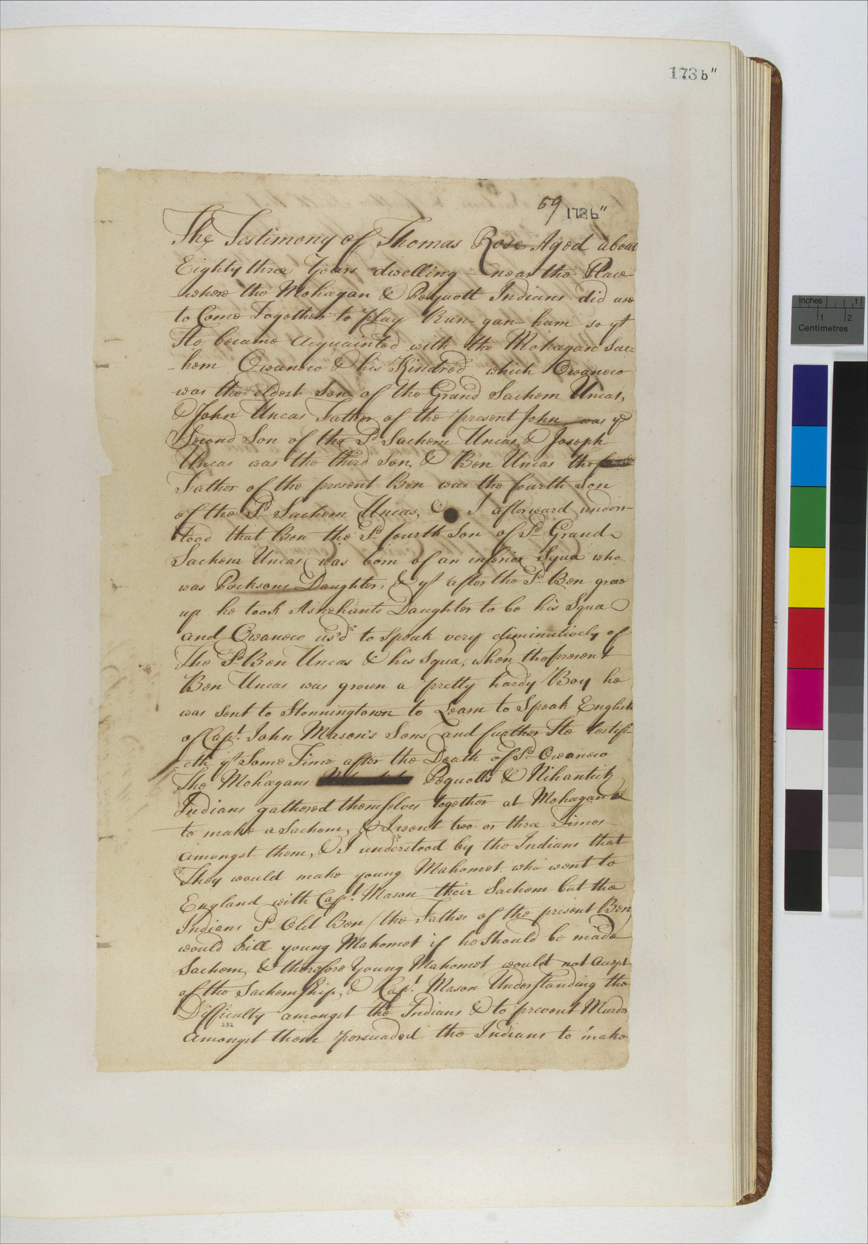 Culture -- Disputes; Culture -- Family -- Illegitimacy; Culture -- Genealogy; Culture -- Inheritance; Culture -- Leadership; Culture -- Recreation; Culture -- Rites/Ceremonies -- Powwow; Culture -- Violence; Genealogy; Government -- Colonial -- Colony of Connecticut -- General Court; Government -- Tribal -- Mohegan -- Mason Faction -- Sachems/Sagamores -- John Uncas (1736-c.1769); Government -- Tribal -- Mohegan -- Mason Faction -- Sachems/Sagamores -- Mahomet (1723-1736); Government -- Tribal -- Mohegan -- Pro-Government Faction -- Sachems/Sagamores -- Ben Uncas II (1726-1746); Government -- Tribal -- Mohegan -- Pro-Government Faction -- Sachems/Sagamores -- Major Ben Uncas I (1723-1725); Government -- Tribal -- Mohegan -- Sachems/Sagamores -- Owaneco (1683-1715); Government -- Tribal -- Mohegan -- Sachems/Sagamores -- Uncas (1638-1683); Land -- Complaints -- Controversies -- Mohegan Case; Land -- Reservation/Reserve -- Mohegan; Law -- Imperial Actions -- Case Names -- Mohegan Case; Law -- Imperial Actions -- Privy Council -- Civil Appeals; Relations -- Colonial Affairs; Relations -- Tribal Affairs; Tribes/Communities -- Mohegan; Tribes/Communities -- Niantic -- Western; Tribes/Communities -- Pequot -- Eastern; Tribes/Communities -- Pequot -- Western; Vital Records -- Deaths; YIPP -- Colony of Connecticut Collection, 1603-1783