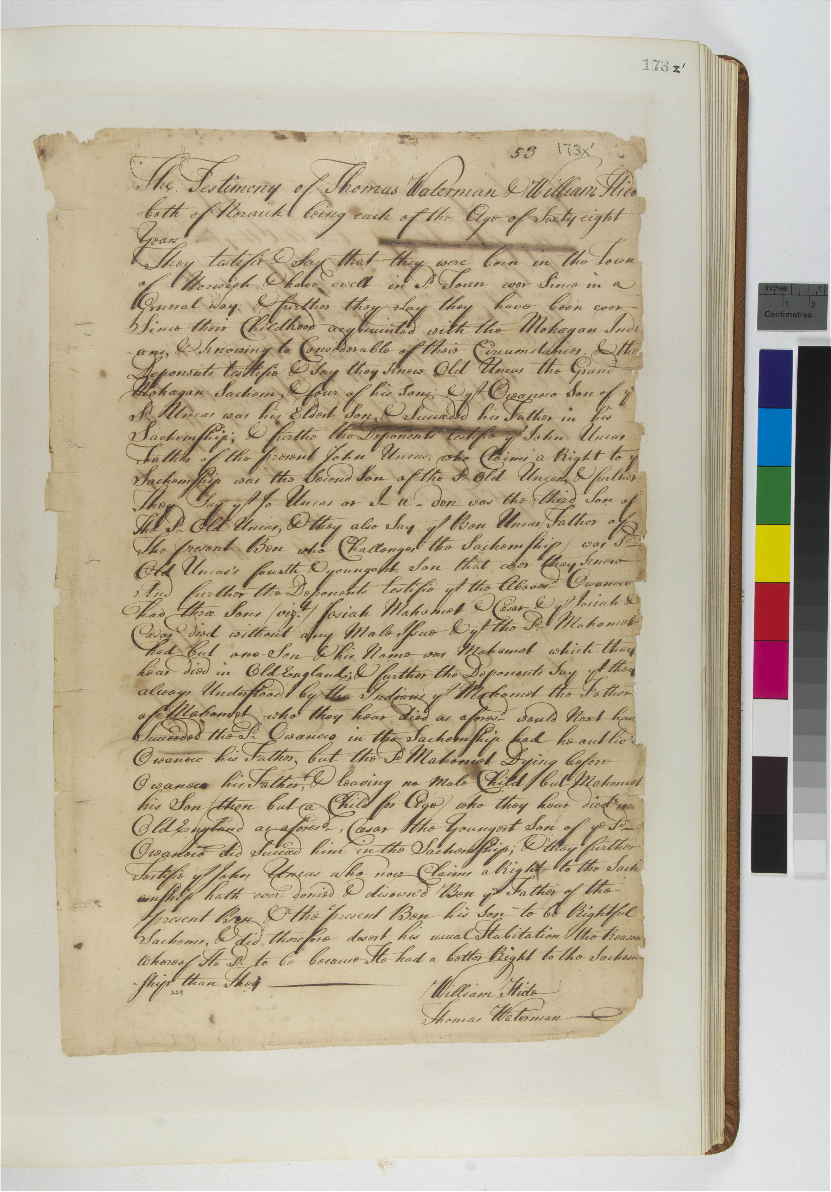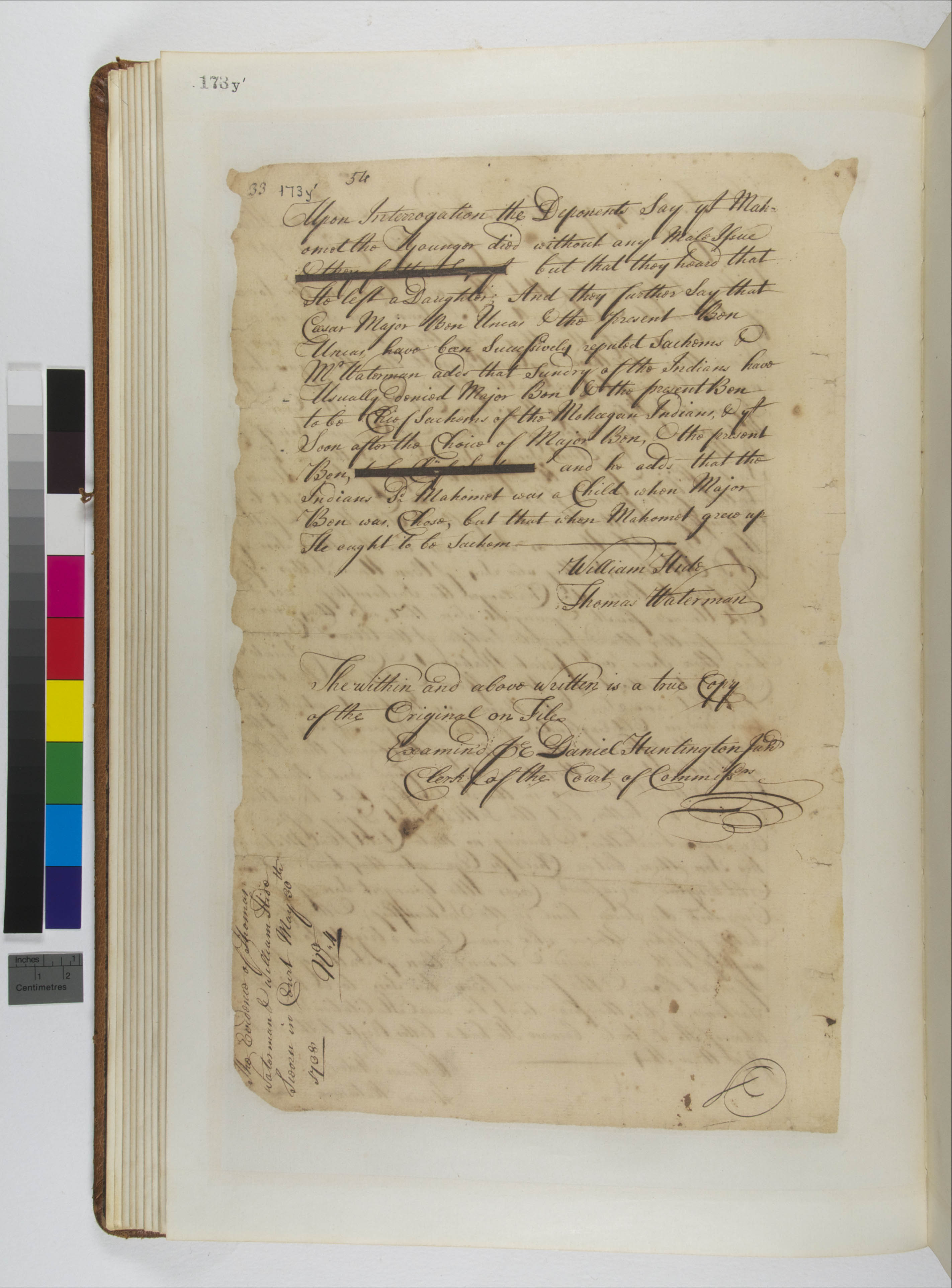 Attawanhood (Mentioned within document); Hide, William (Mentioned within document); Huntington, Daniel (Attestor); Mahomet (Mentioned within document); Owaneco, 1640- (Mentioned within document); Uncas, 1590-1683 (Mentioned within document); Uncas, Benjamin II, -1746 (Mentioned within document); Uncas, Benjamin, 1647-1726 (Mentioned within document); Uncas, Ceasar, -1722 (Mentioned within document); Uncas, John (Mentioned within document); Uncas, John, Sr (Mentioned within document); Uncas, Josias, -1690 (Mentioned within document); Waterman, Thomas (Mentioned within document); Yeomanum, Mahomet, 1700-1736 (Mentioned within document)