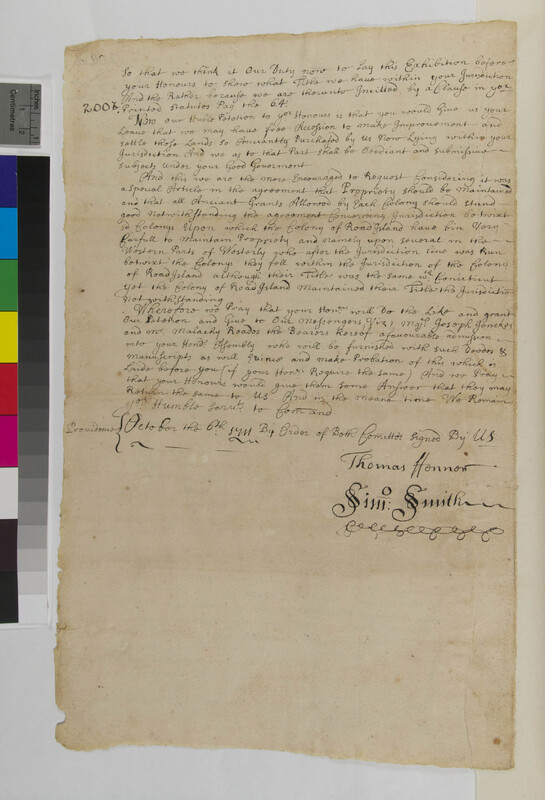 Government -- Colonial -- Colony of Connecticut -- Governors; Government -- Colonial -- Colony of Rhode Island -- Towns -- Providence; Government -- Colonial -- Colony of Rhode Island -- Towns -- Wesquannaug; Land -- Conveyances -- Deed/Title; Land -- Conveyances -- Purchase; Land -- Description -- Boundaries; Land -- Native Right; Law -- Jurisdiction; Relations -- Colonial Affairs; Relations -- Intercolonial; Relations -- Tribal Affairs; Tribes/Communities -- Narragansett; Tribes/Communities -- Nipmuc; Tribes/Communities -- Pawtuxet; Tribes/Communities -- Quinebaug; YIPP -- Colony of Connecticut Collection, 1603-1783; YIPP -- Colony of Rhode Island Collection, 1600-1783