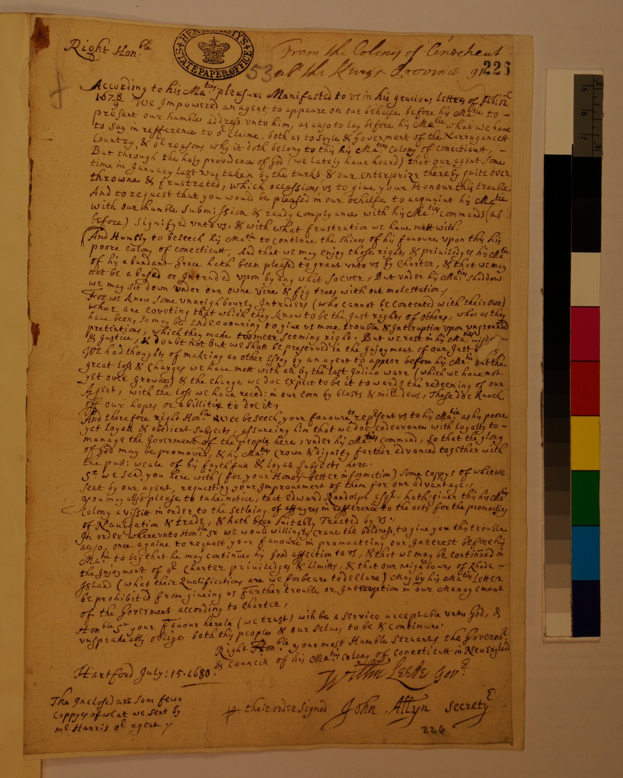Copy of a Letter from the Colony of Connecticut to His Majesty's Secretary of State regarding Narragansett Country