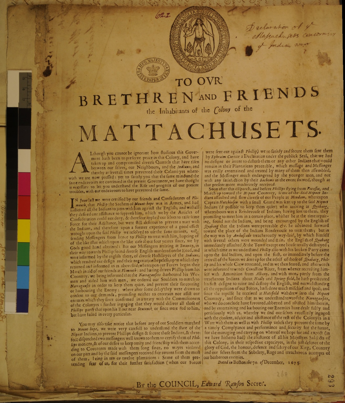 Declaration of the Colony of Massachusetts concerning King Philip's War