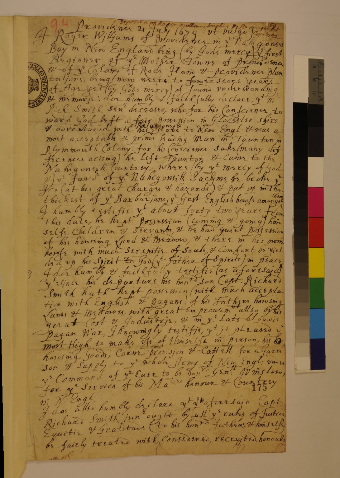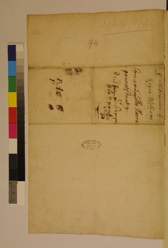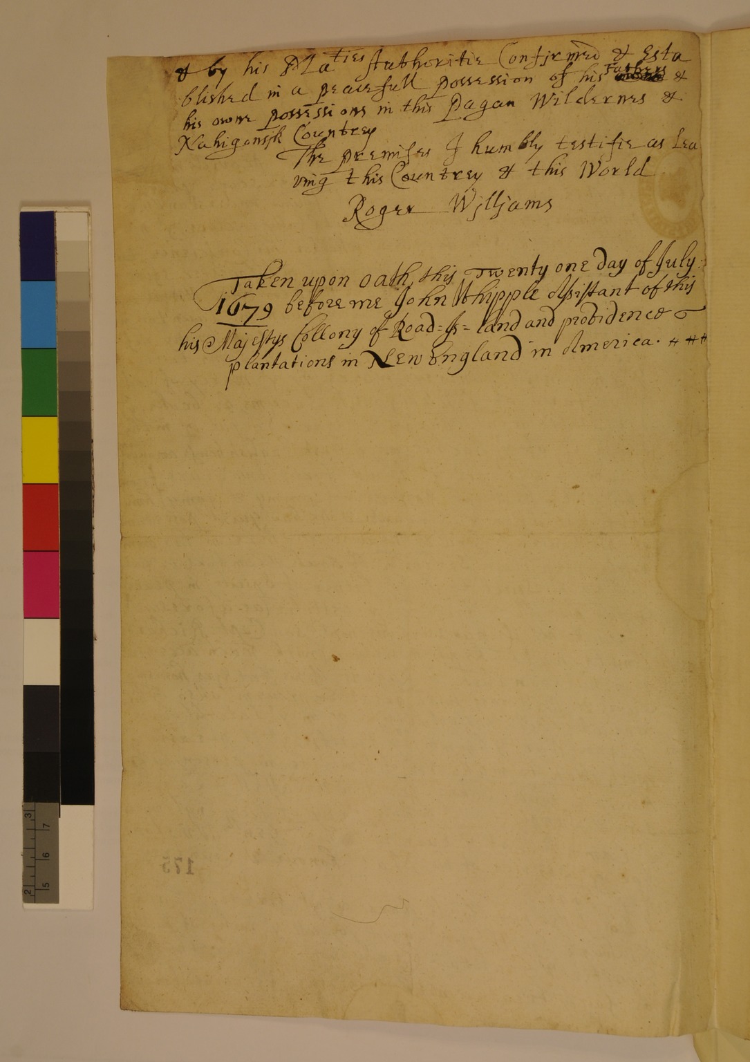 Deposition of Roger Williams regarding the Narragansett Country