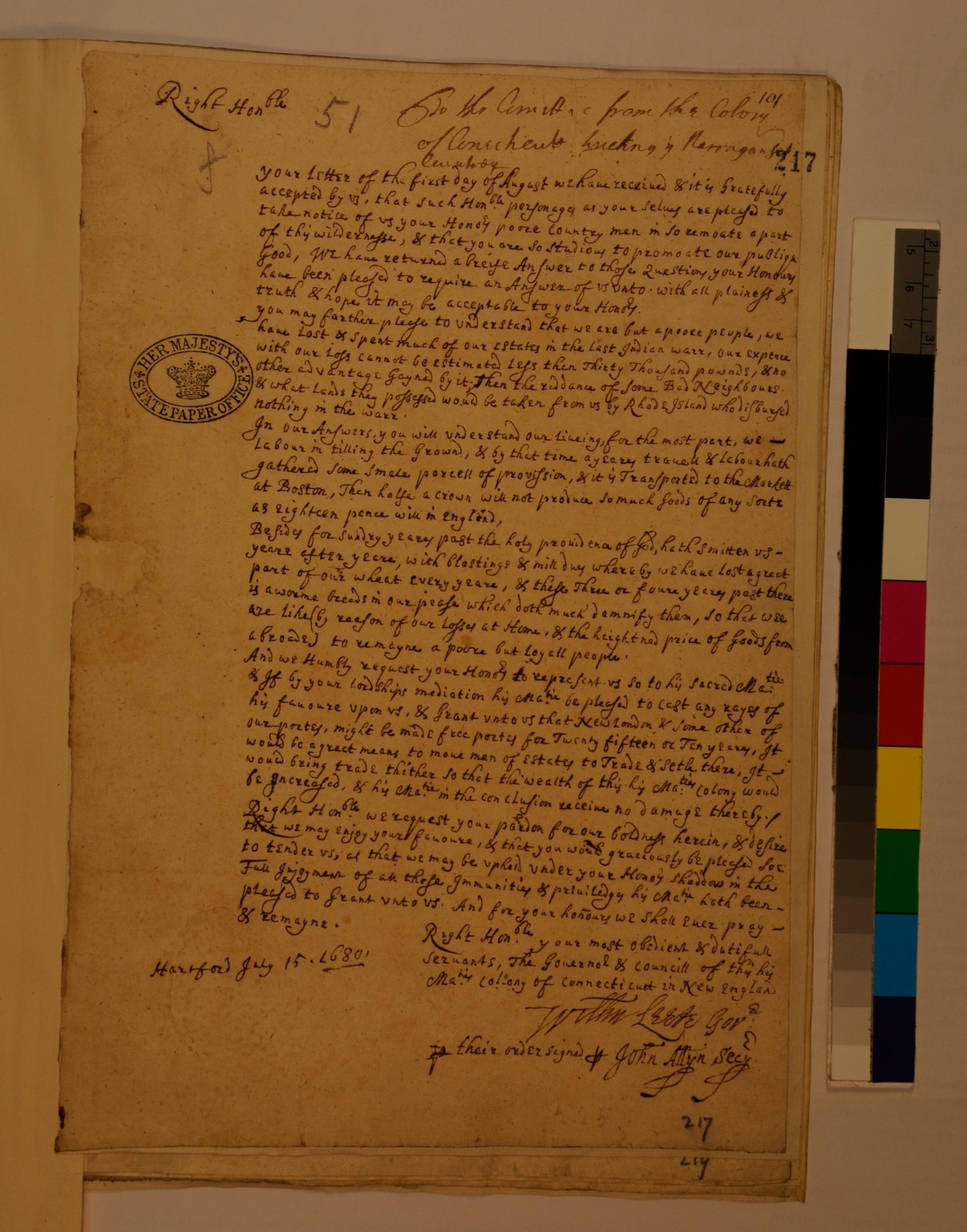 Letter from the Governor and Council of the Colony of Connecticut to the Privy Council by way of William Blathwayt