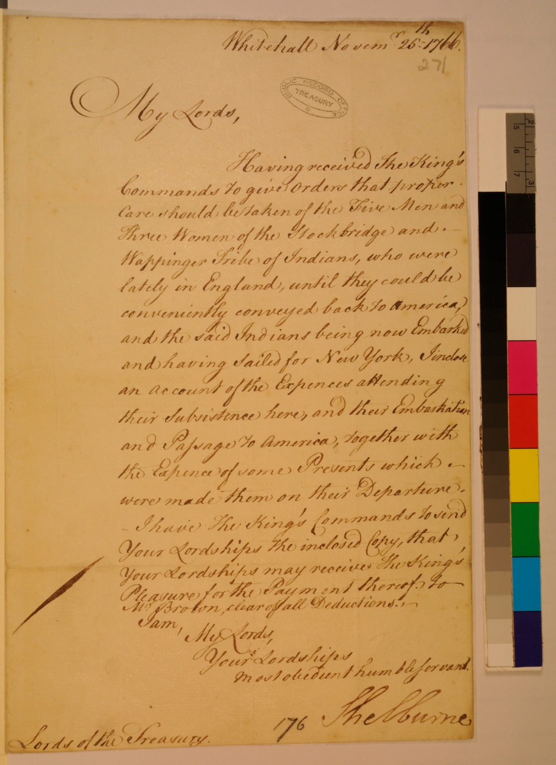 Lord Shelburne, Enclosing an Account of the Expenses of a Visit by Eight Indians of the Stockbridge and Wappinger Tribe, Lately Returned to New York