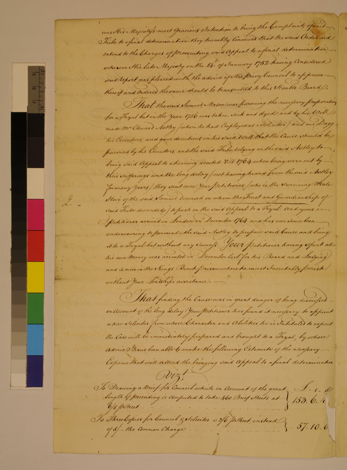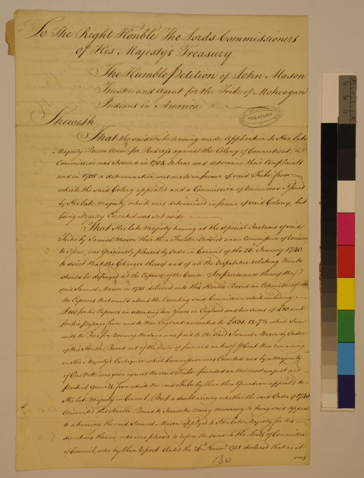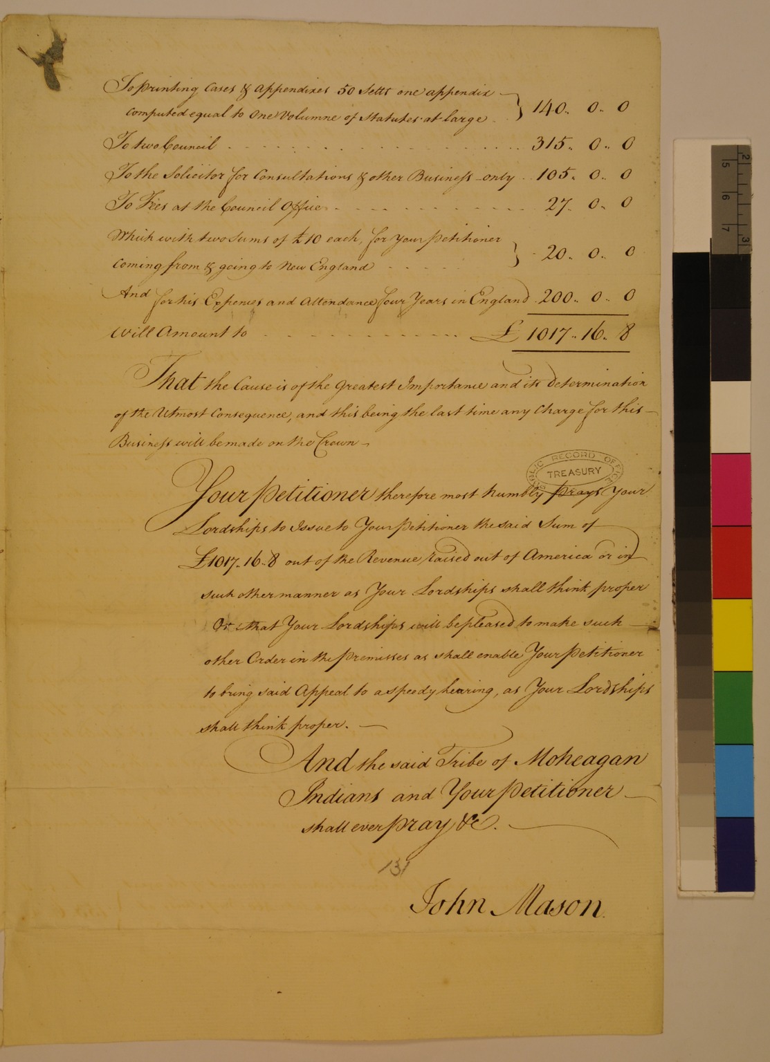 Report on the Petition of John Mason, Trustee and Agent for the Tribe of Mohegan Indians in America, for £1,017 for Prosecuting the Tribe's Appeal in a Longstanding Dispute with the Colony of Connecticut