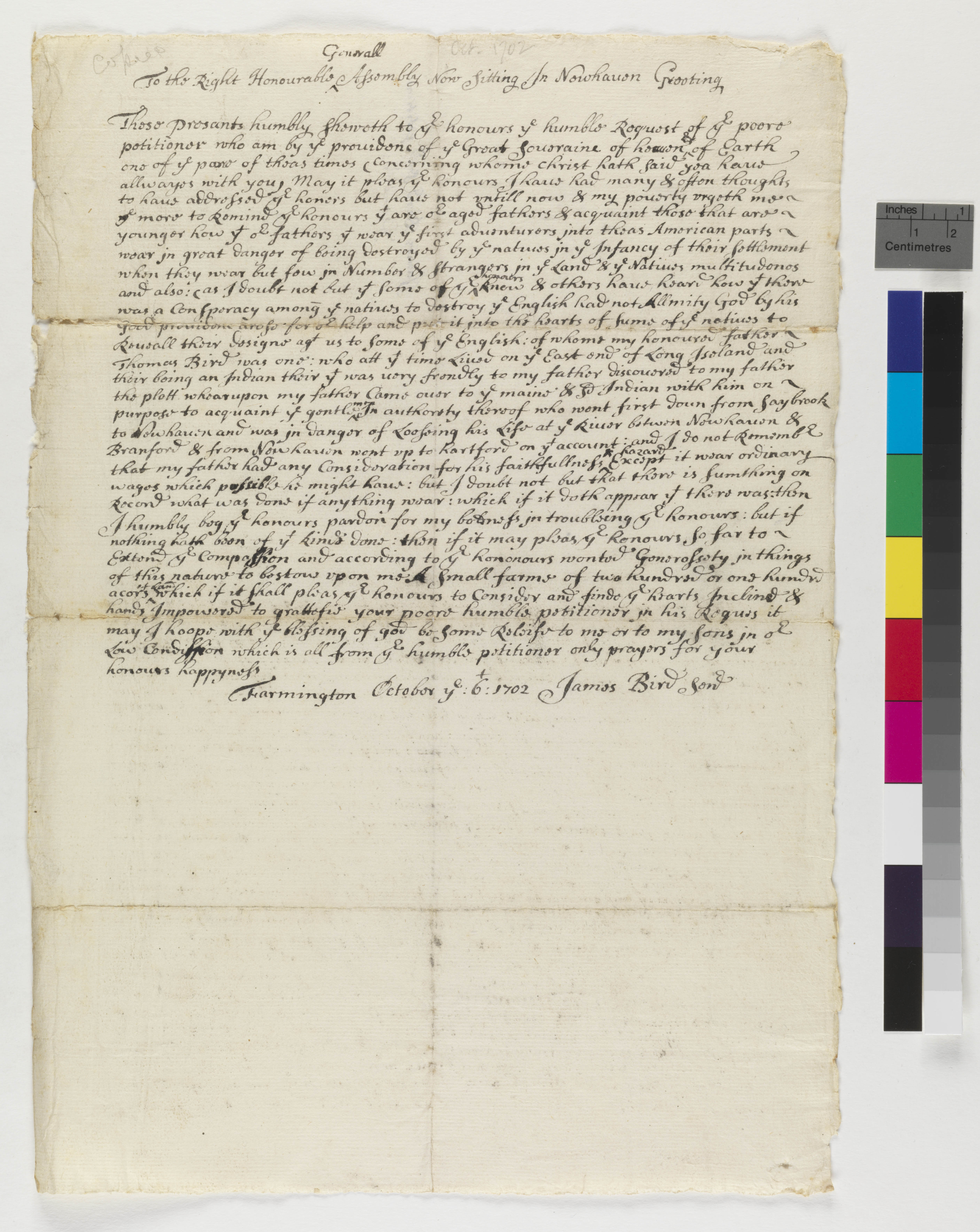 Copy of the Petition of James Bird, Sr. to the General Assembly of the Colony of Connecticut