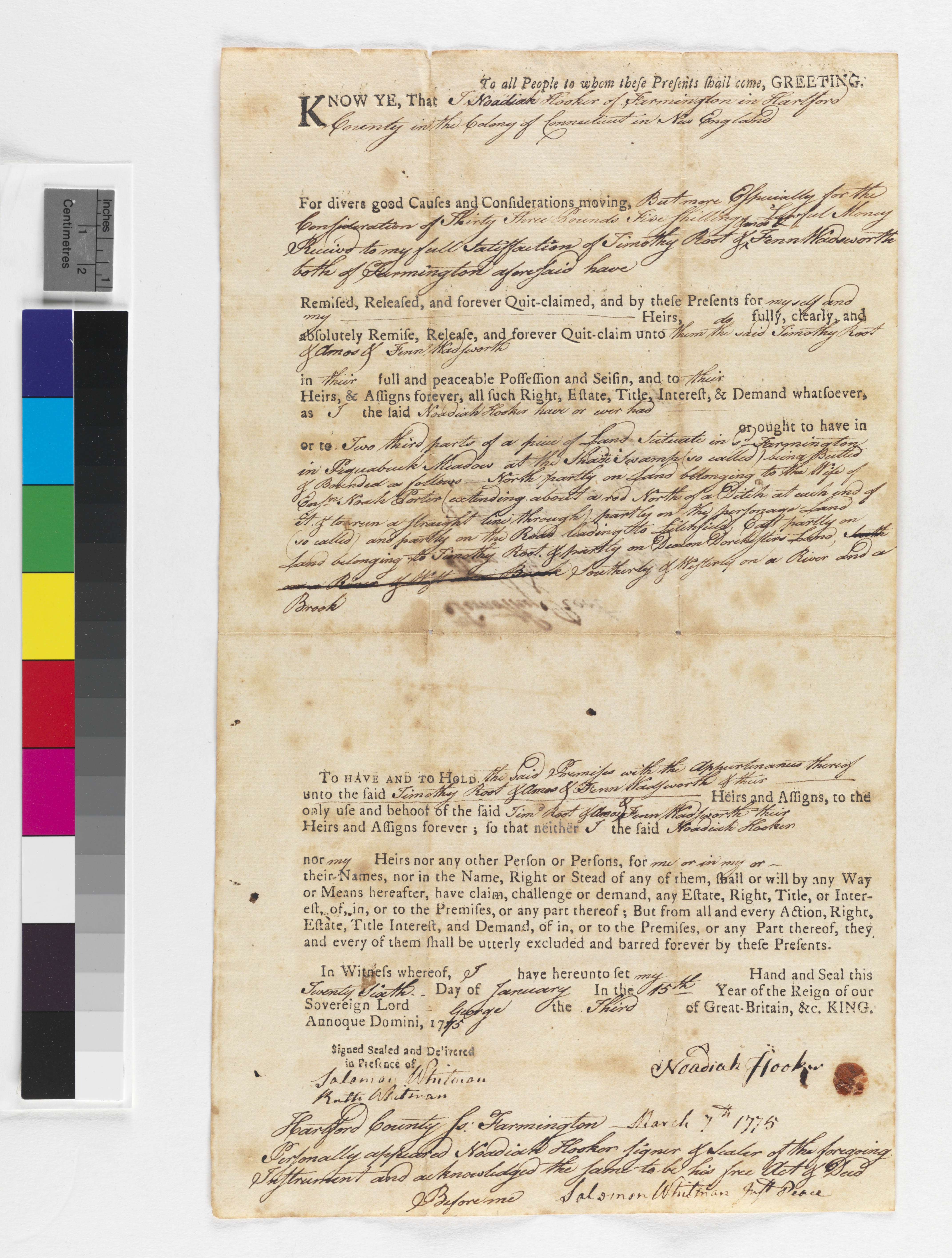 Deed from Noadiah Hooker to Timothy Root and Fenn Wadsworth