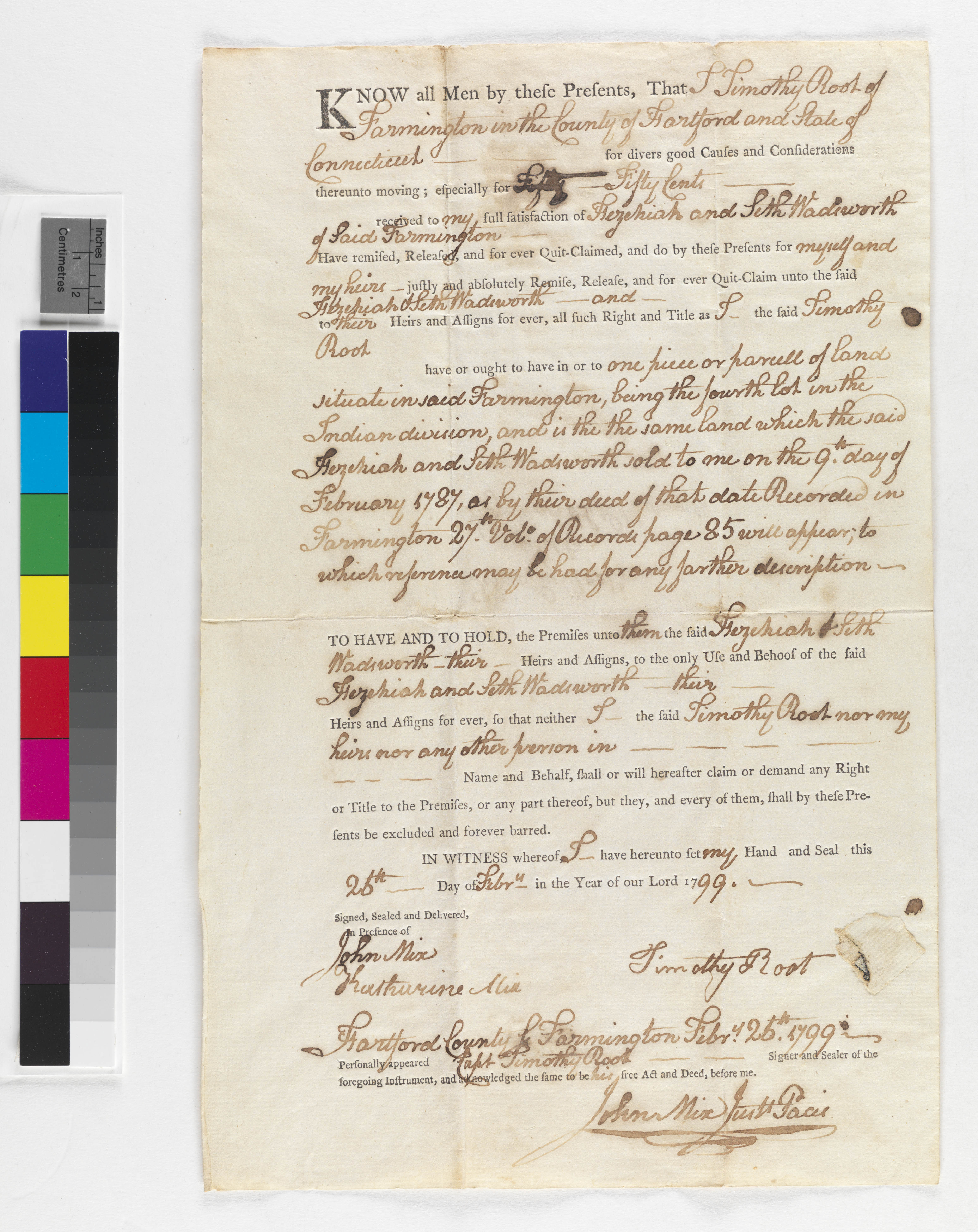 Deed of Timothy Root to Hezekiah and Seth Wadsworth