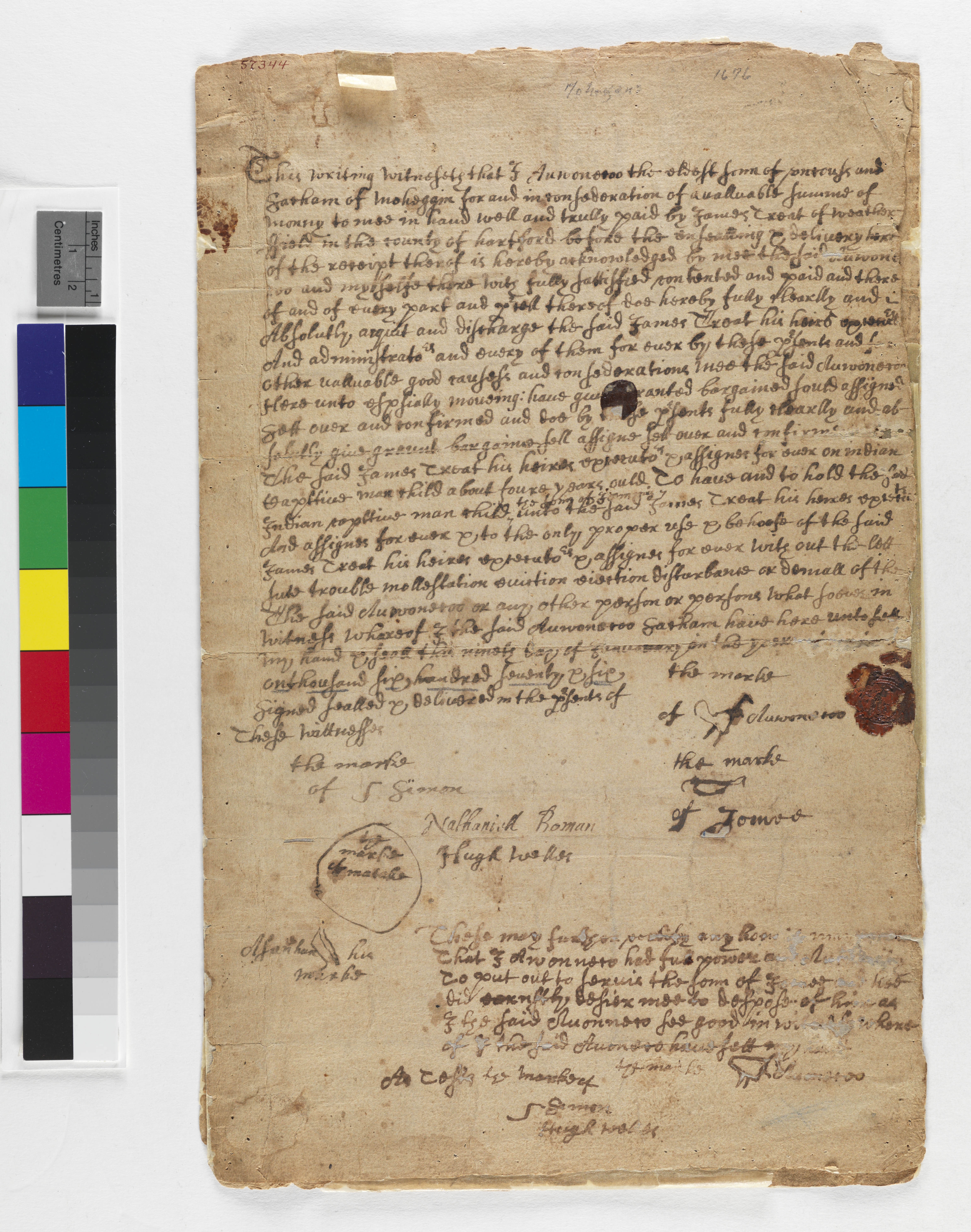 Asanhan (Witness); Matako (Witness); Roman, Nathaniel (Witness); Simon (Mentioned within document); Treat, James (Recipient); Uncas, 1590-1683 (Mentioned within document); Welles, Hugh (Witness)