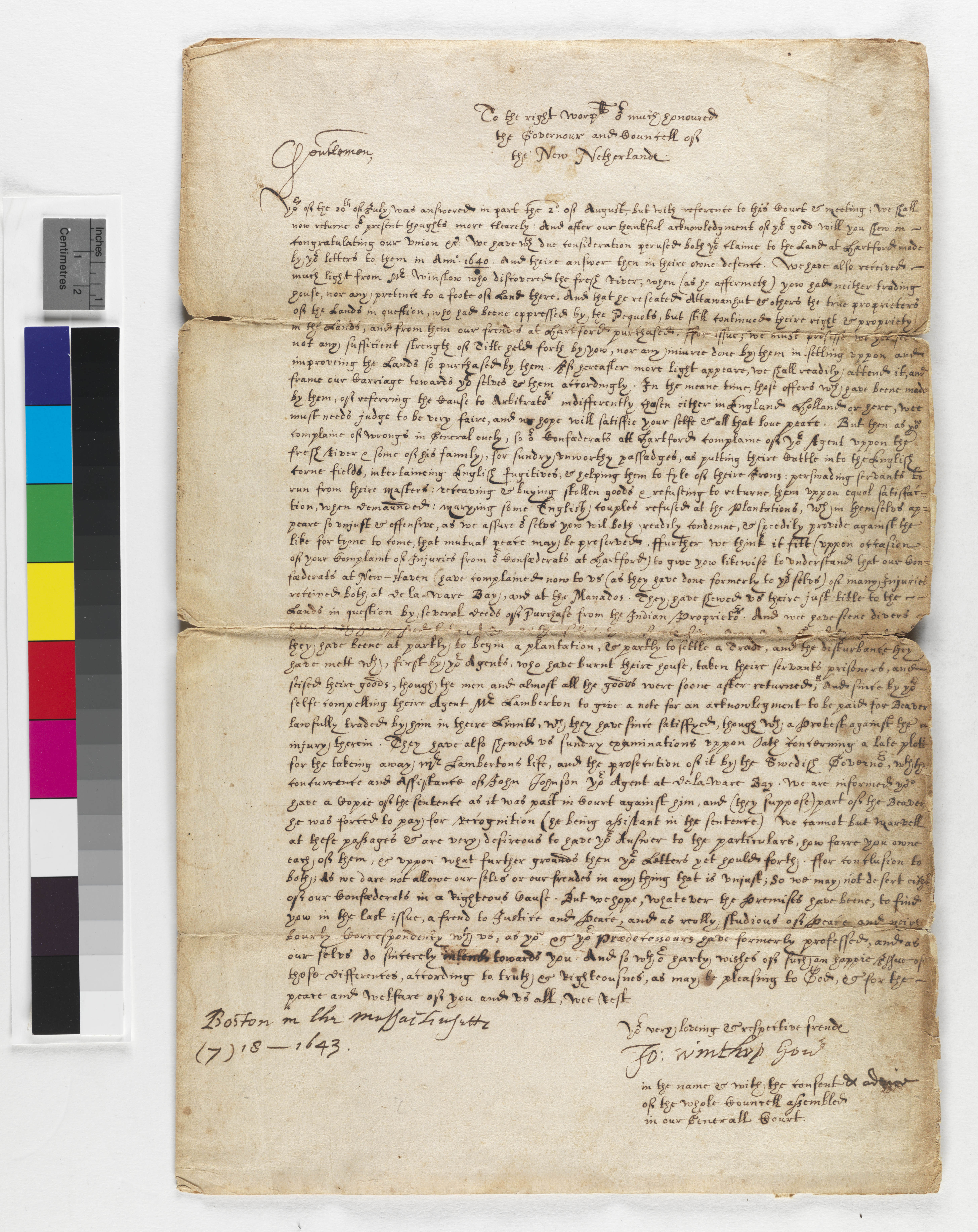Letter from John Winthrop, Sr. to the Governor and Council of New Netherlands