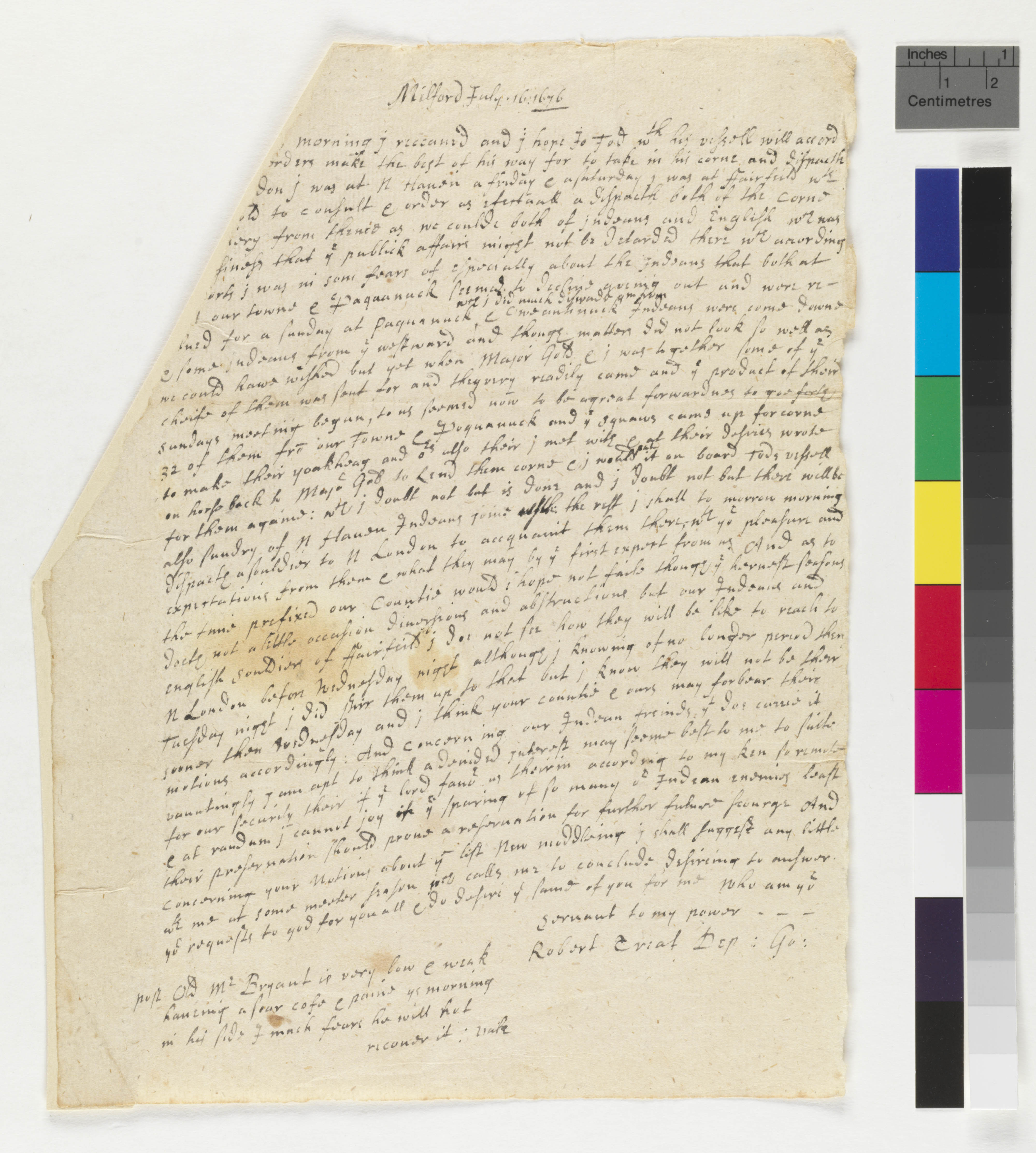 Bryan, Alexander (1602-1679) (Mentioned within document); Gold, Nathan (Mentioned within document); Todd, John (1642-1723) (Mentioned within document); Treat, Robert, Sr., 1624-1710 (Author); Unknown (Recipient)