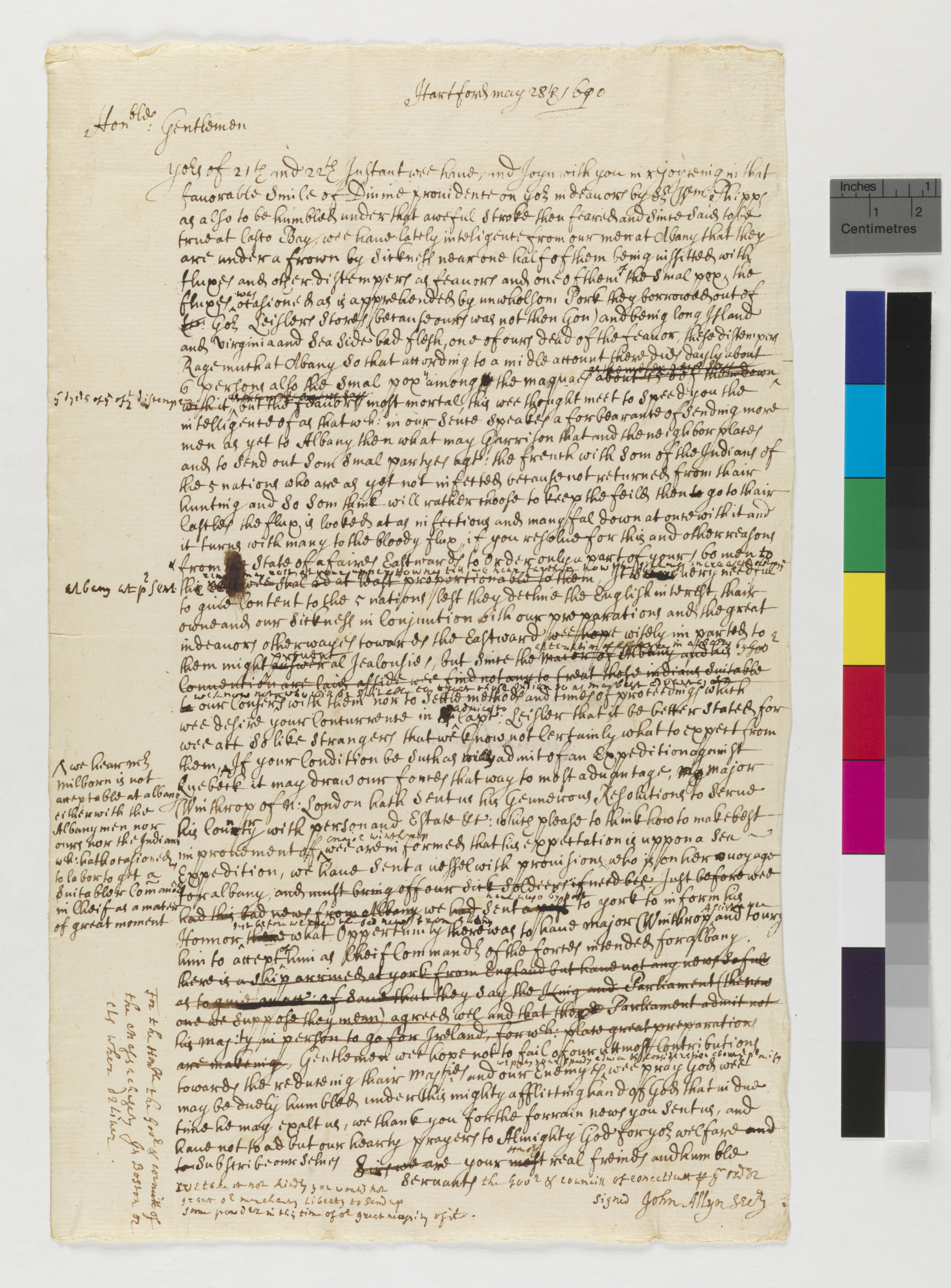 Commerce/Trade -- Ammunition/Weapons; Commerce/Trade -- Merchants; Culture -- Fishing/Hunting; Disease/Illness -- Flux; Disease/Illness -- Food Poisoning; Disease/Illness -- Small Pox; Geopolitics -- Canada/New France; Geopolitics -- Canadian Native Allies; Government -- Colonial -- Colony of Connecticut; Government -- Colonial -- Massachusetts Bay Colony; Government -- Colonial -- Province of New York; Government -- Imperial -- Agendas -- Military Affairs; Land -- Use -- Hunting/Fishing/Fowling; Military -- Garrisons; Military -- Maritime; Military -- Naval Encounters; Military -- War -- King Williamís War (1688-1697); Relations -- Colonial Affairs; Repository -- Connecticut Historical Society; Tribes/Communities -- Five Nations; Tribes/Communities -- Mohawk; YIPP -- Colony of Connecticut Collection, 1603-1783