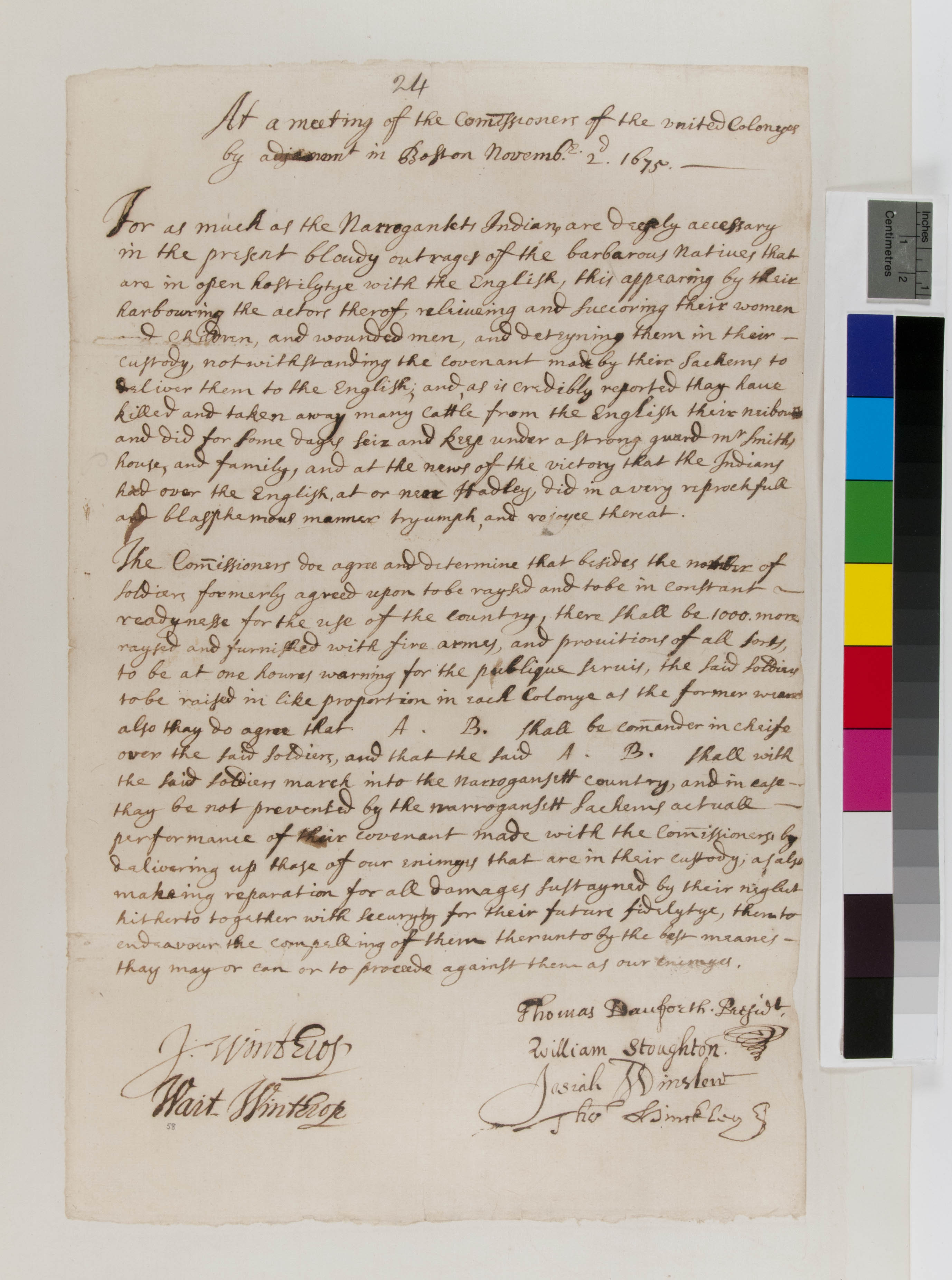 Agreement of the Commissioners of the United Colonies at Boston to Raise a Thousand Men to March against the Narragansetts