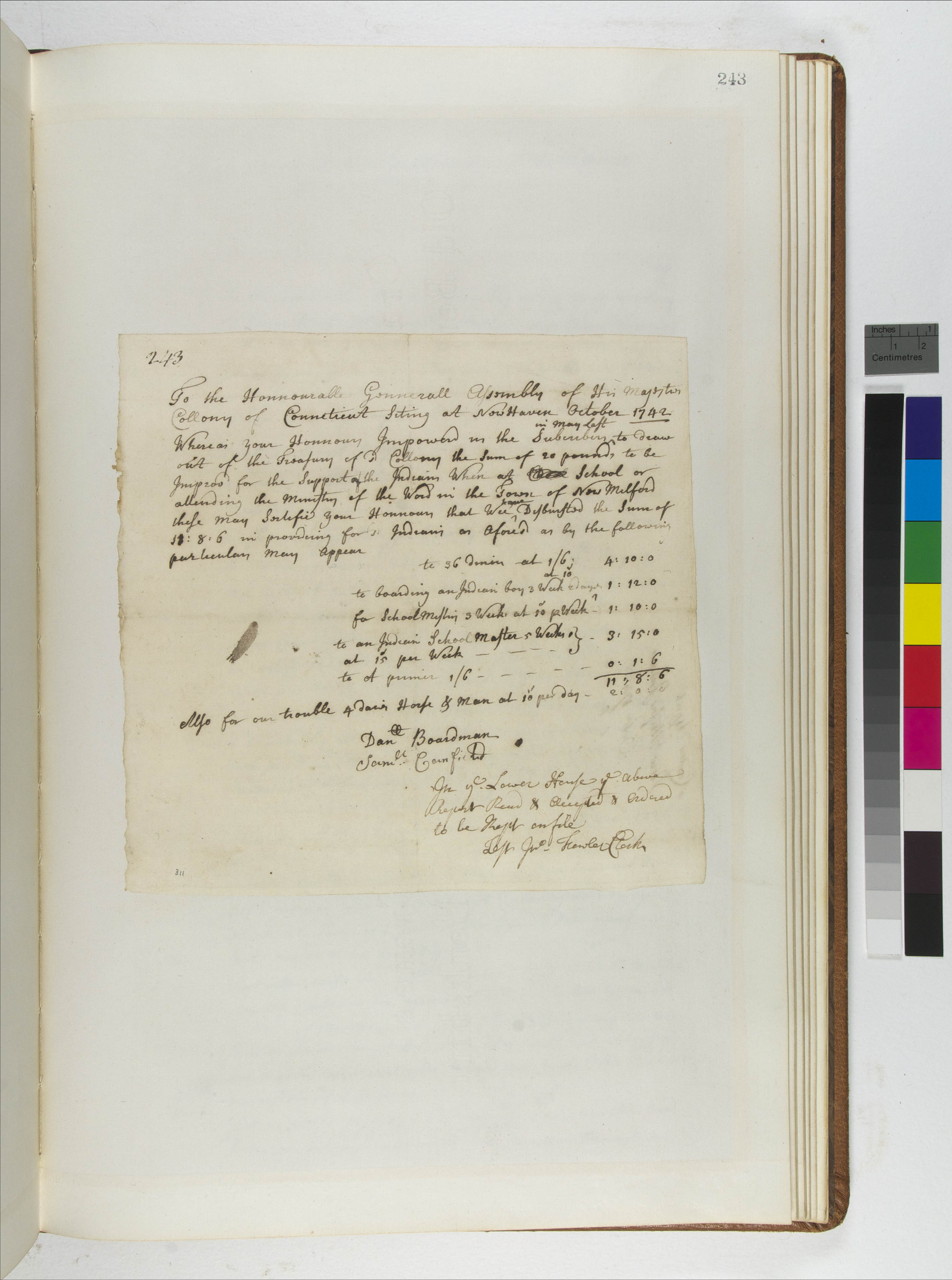 Accounting/Finance -- Expenses; Education/Schools -- Missions; Government -- Colonial -- Colony of Connecticut -- General Assembly -- Committees; Law -- Legislative Process -- Reports -- Accepted; Relations -- Colonial Affairs; Relations -- Tribal Affairs; Repository -- Connecticut State Library; Tribes/Communities -- New Milford Indians; YIPP -- Colony of Connecticut Collection, 1603-1783