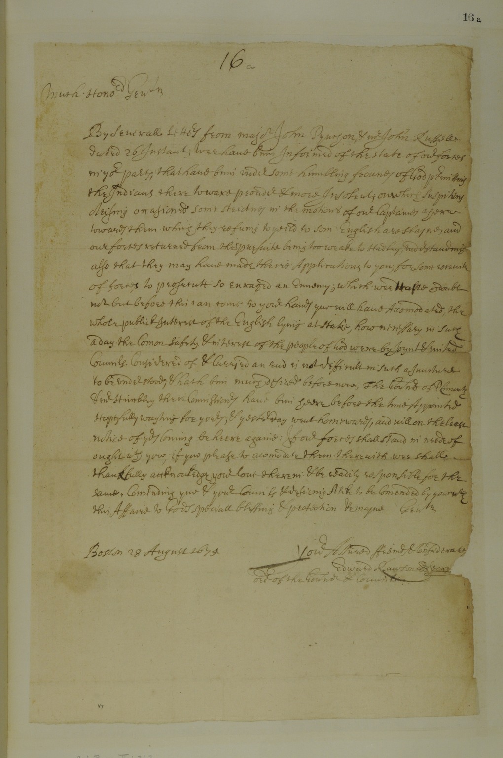 Letter from Edward Rawson to the Governor and Council of Connecticut in relation to the Indian War