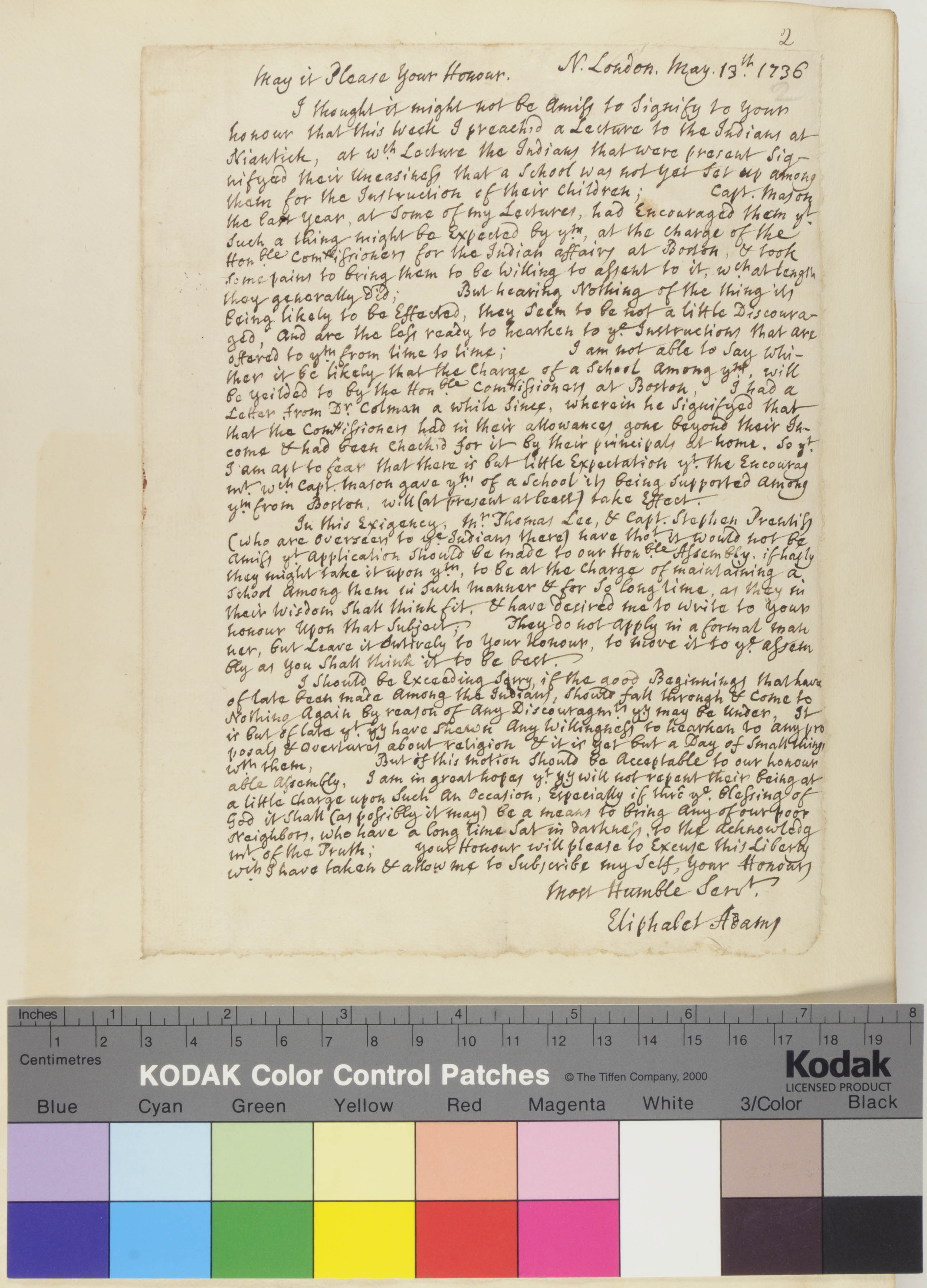 Letter from Eliphalet Adams about the Niantic Indian School