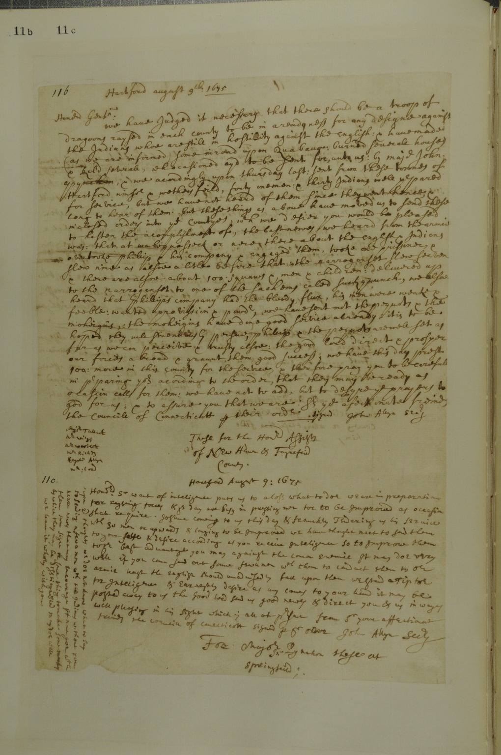 Letter from John Allyn to Major John Pynchon about Indian Reinforcements