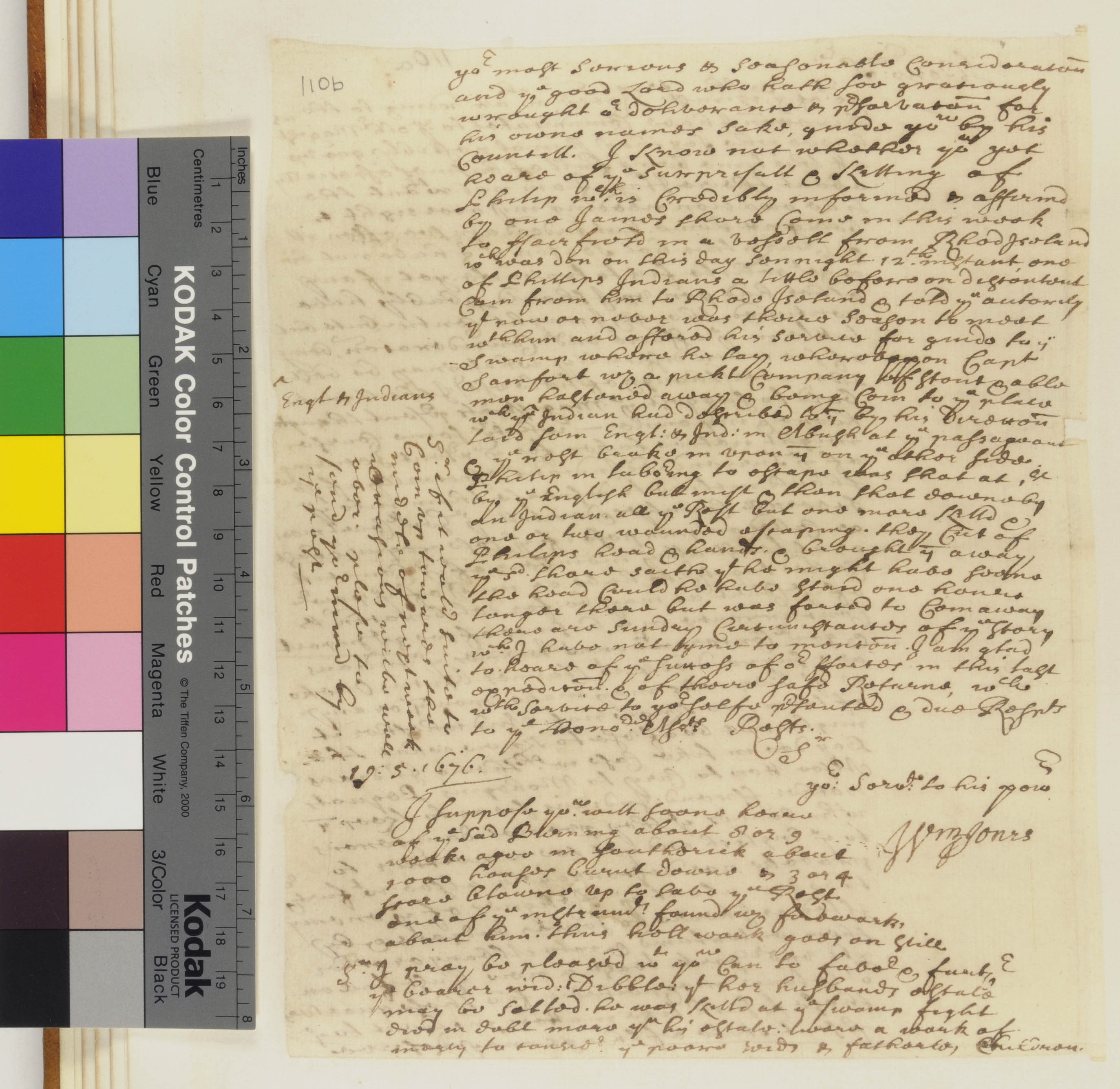 Letter from William Jones to Governor William Leete about Surrendered Indians and a Report of Philip's Death
