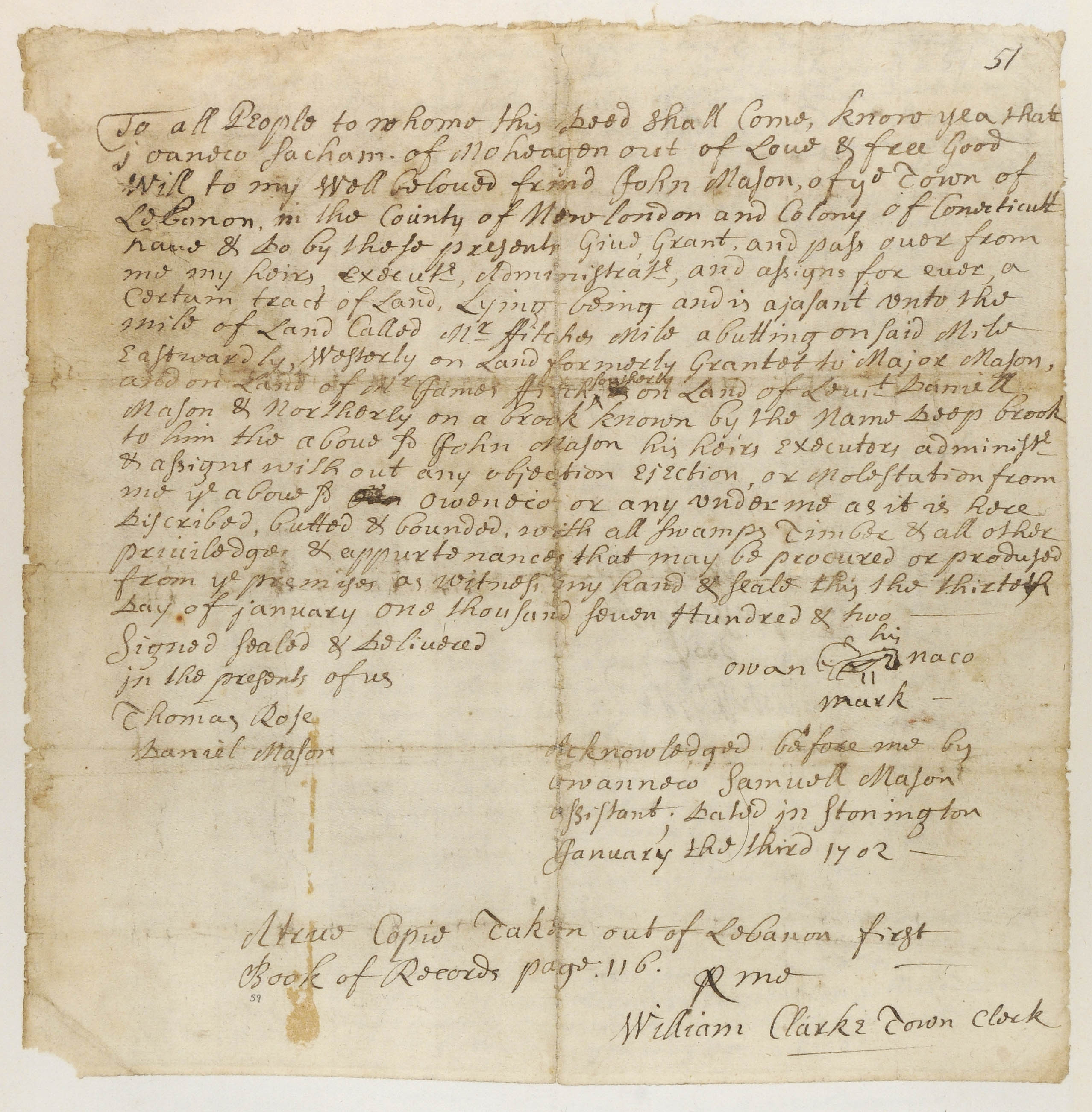 Owaneco's Deed of Land at Lebanon to John Mason