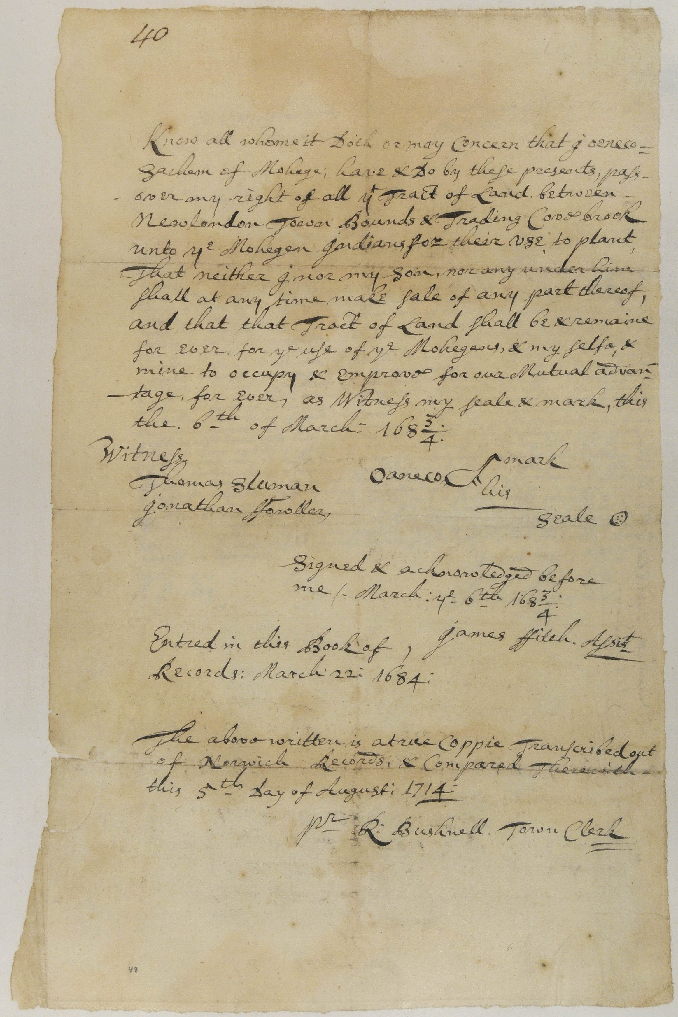 Owaneco's Transfer of His Right to the Lands around New London bounds to the Mohegan People