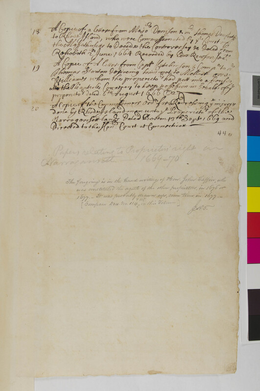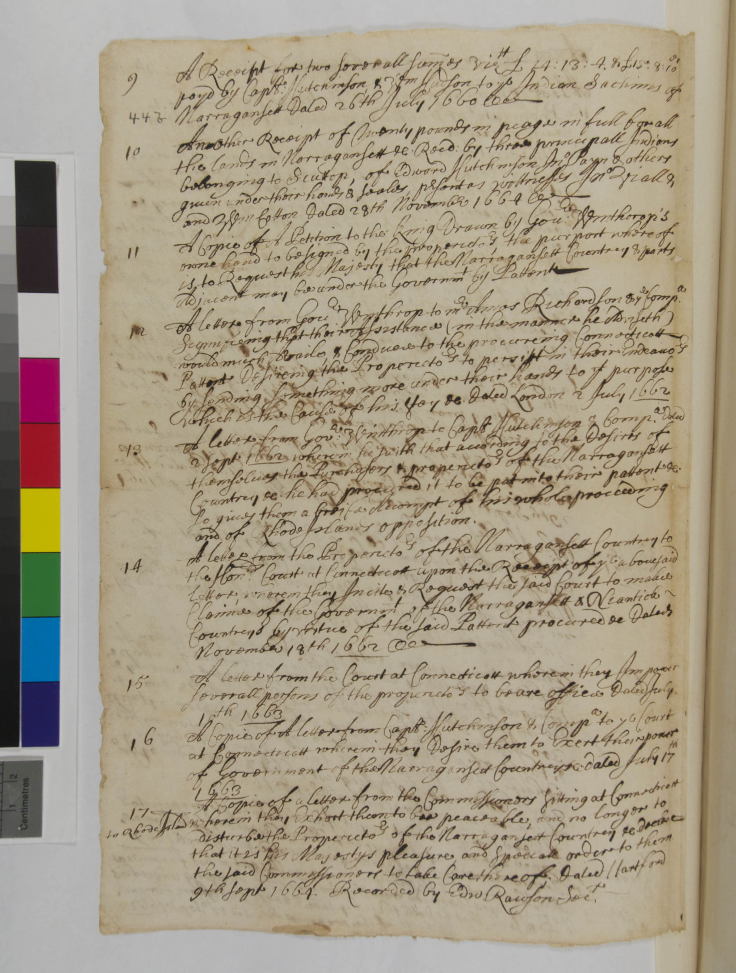 Culture -- Wampum; Government -- Colonial -- Colony of Connecticut -- General Court; Government -- Colonial -- Colony of Rhode Island; Government -- Colonial -- Massachusetts Bay Colony -- General Court; Government -- Imperial -- Agencies -- King's Commissioners; Government -- Imperial -- Monarchs:: -- Charles Stuart II (1660-1685); Government -- Tribal -- Narragansett; Land -- Conveyances -- Deed/Title; Land -- Conveyances -- Patent/Charter; Land -- Use -- Improvement -- Farms; Law -- Charters/Patents; Relations -- Colonial Affairs; Relations -- Intercolonial; Relations -- Tribal Affairs; Tribes/Communities -- Narragansett; Tribes/Communities -- Niantic -- Eastern; Tribes/Communities -- Pequot -- Eastern; YIPP -- Colony of Connecticut Collection, 1603-1783; YIPP -- Colony of Rhode Island Collection, 1600-1783