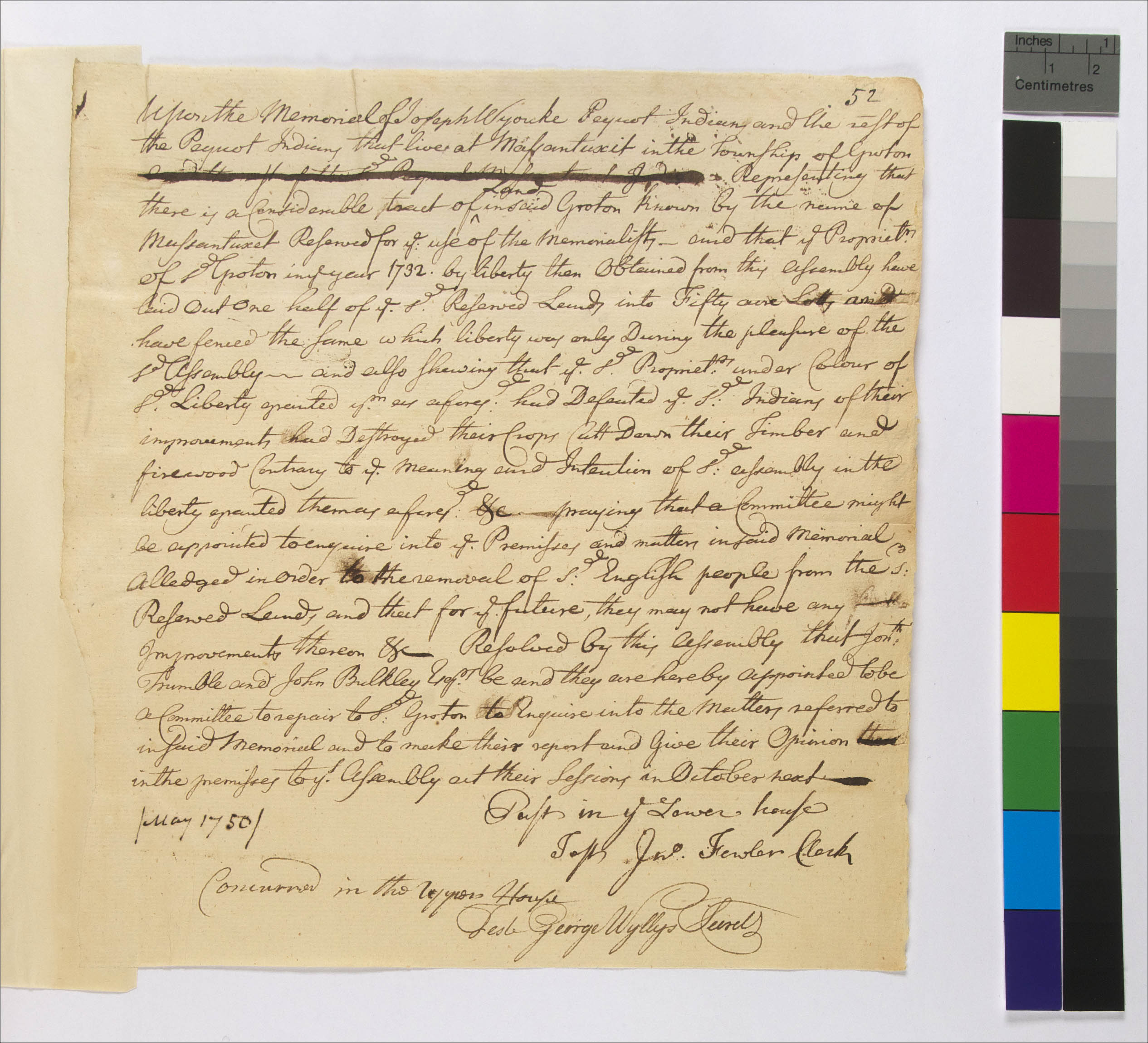 Government -- Colonial -- Colony of Connecticut -- General Assembly -- Committees; Government -- Colonial -- Colony of Connecticut -- General Assembly; Government -- Colonial -- Colony of Connecticut -- Towns -- Groton; Government -- Tribal -- Pequot -- Western -- Sachems/Sagamores -- Joseph Wyoke (1747-c. 1761); Land -- Complaints -- Ejectment; Land -- Complaints -- Encroachment; Land -- Complaints -- Trespass; Land -- Complaints -- Vandalism; Land -- Conveyances -- Grants; Land -- Reservation/Reserve -- Pequot -- Western; Land -- Use -- Improvement -- Agriculture -- Damage to; Land -- Use -- Improvement -- Fences; Land -- Use -- Timber/Firewood; Law -- Legislative Process -- Appointment -- Accepted; Relations -- Colonial Affairs; Relations -- Tribal Affairs; Tribes/Communities -- Pequot -- Western; YIPP -- Colony of Connecticut Collection, 1603-1783