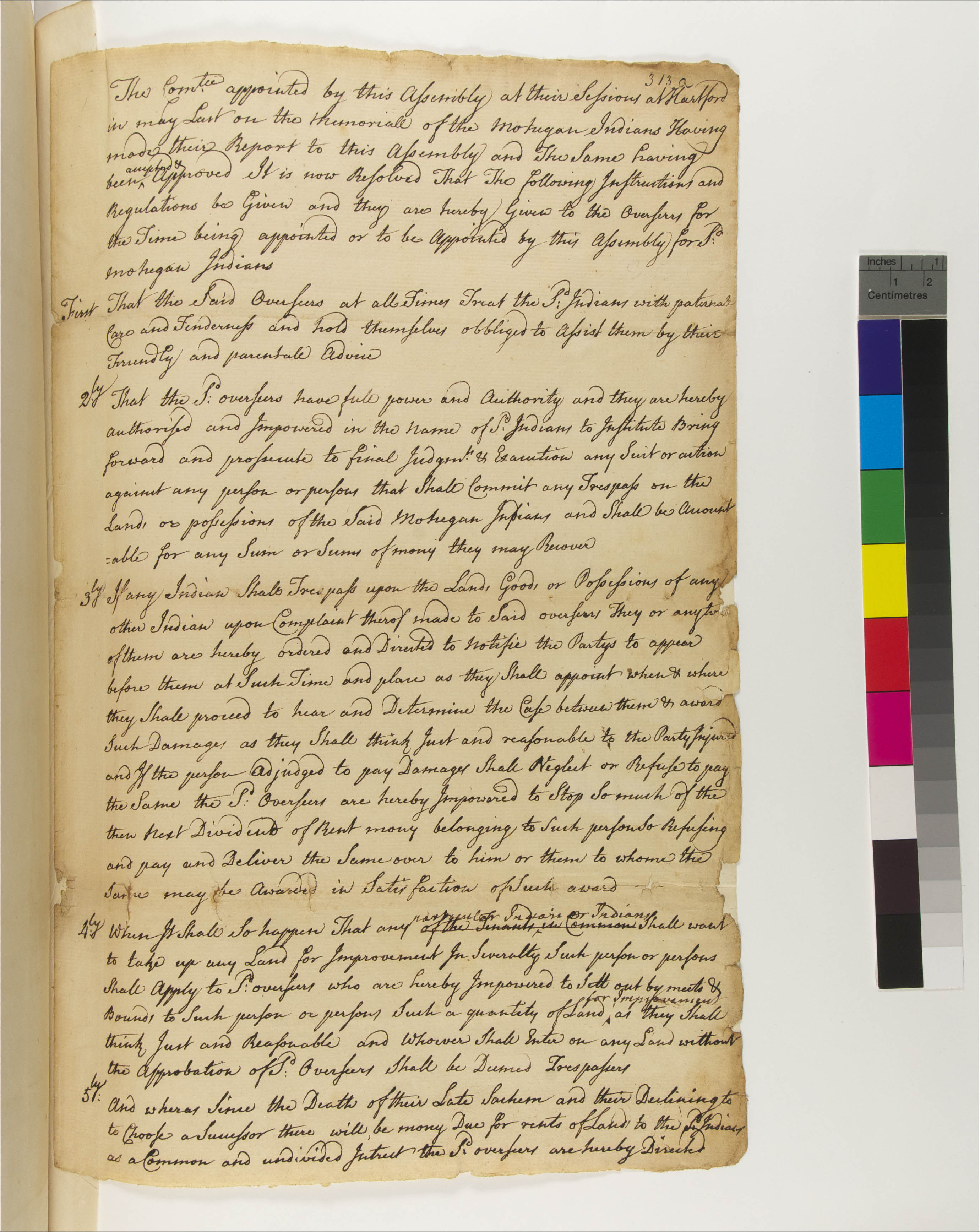 Abstract Ideas -- Friend Indians; Abstract Ideas -- Paternalism; Abstract Ideas -- Peace & Friendship; Accounting/Finance -- Poor Relief; Culture -- Election; Culture -- Leadership -- Sachems; Culture -- Poverty; Government -- Colonial -- Colony of Connecticut -- General Assembly -- Committees; Government -- Colonial -- Colony of Connecticut -- General Assembly; Government -- Colonial -- Colony of Connecticut -- Guardians/Overseers; Government -- Tribal -- Mohegan -- Election; Government -- Tribal -- Mohegan -- Pro-Government Faction -- Sachems/Sagamores -- Ben Uncas III (1746-1769); Land -- Complaints -- Encroachment; Land -- Complaints -- Trespass; Land -- Rental; Land -- Reservation/Reserve -- Mohegan; Land -- Use -- Improvement -- Fences; Land -- Use -- Improvement -- Fire; Land -- Use -- Improvement; Land -- Use -- Timber/Firewood; Law -- Civil Actions -- Penalty -- Damages; Law -- Civil Actions -- Property Issues -- Trespass; Law -- Civil Actions -- Torts -- Trespass; Law -- Criminal Actions -- Misdemeanors -- Trespass; Law -- Legislative Process -- Acts/Resolves -- Accepted; Law -- Procedure -- Power of attorney; Relations -- Colonial Affairs; Relations -- Tribal Affairs; Repository -- Connecticut State Library; Tribes/Communities -- Mohegan; YIPP -- Colony of Connecticut Collection, 1603-1783
